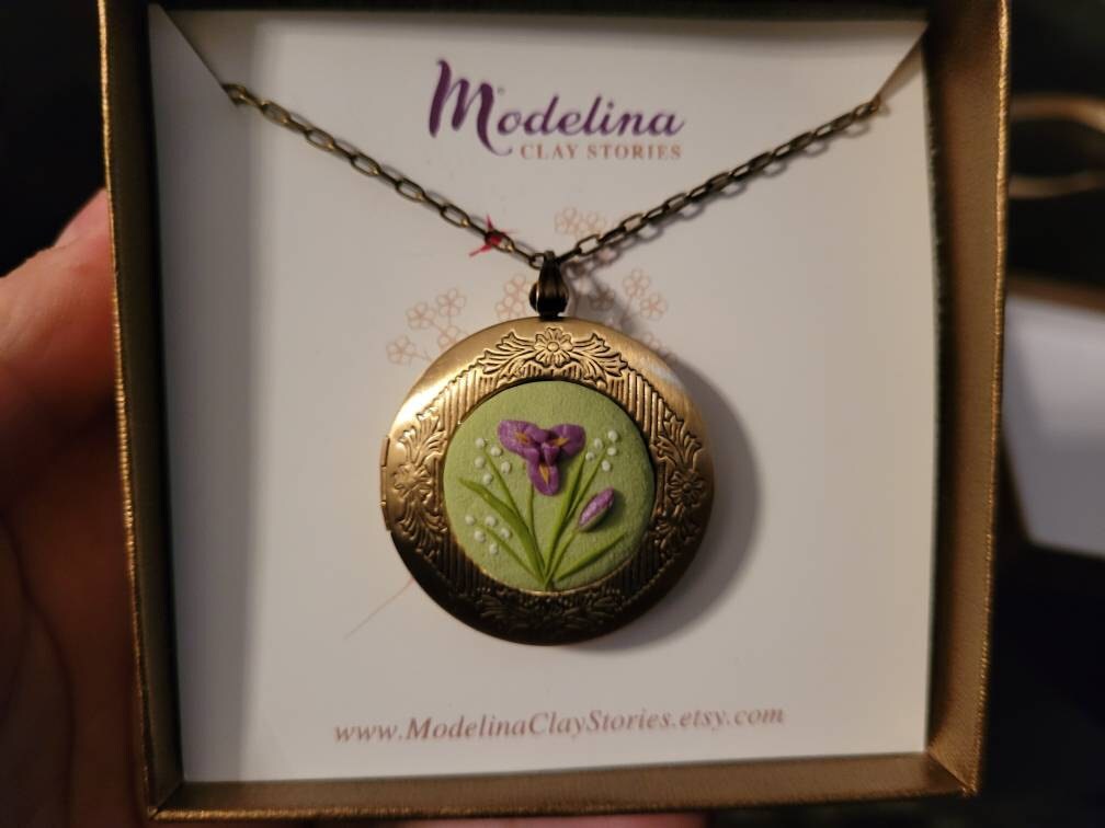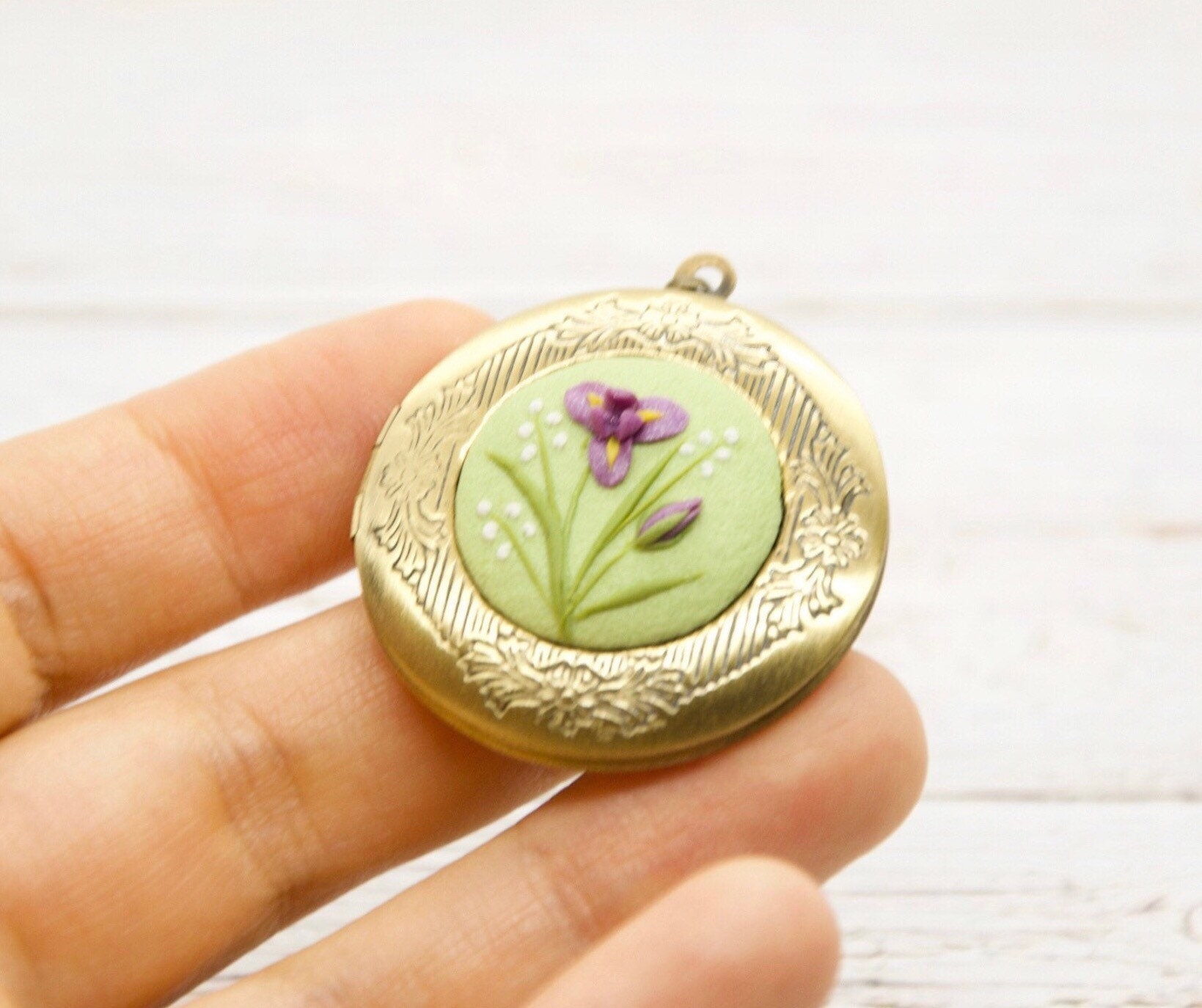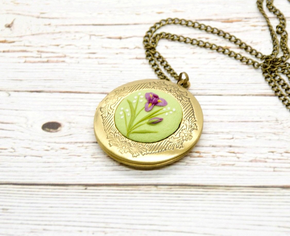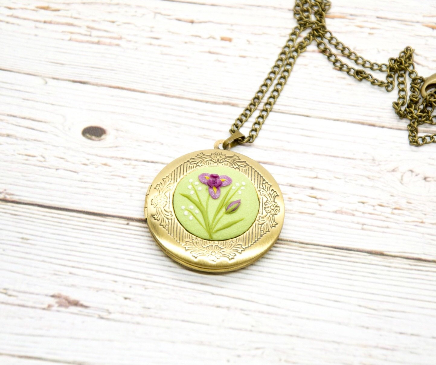 Personalized Iris Photo Locket Necklace, Floral Clay Pendant