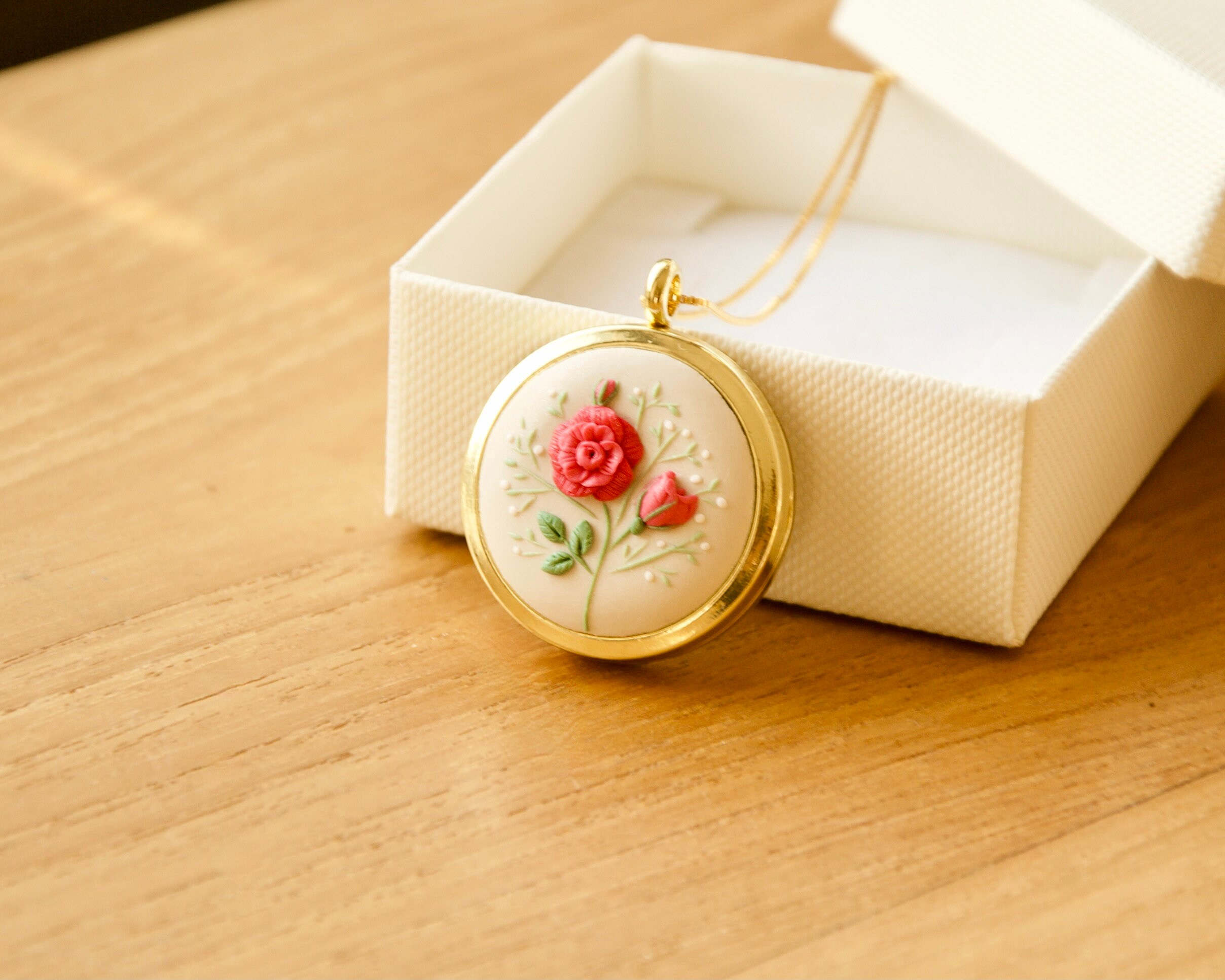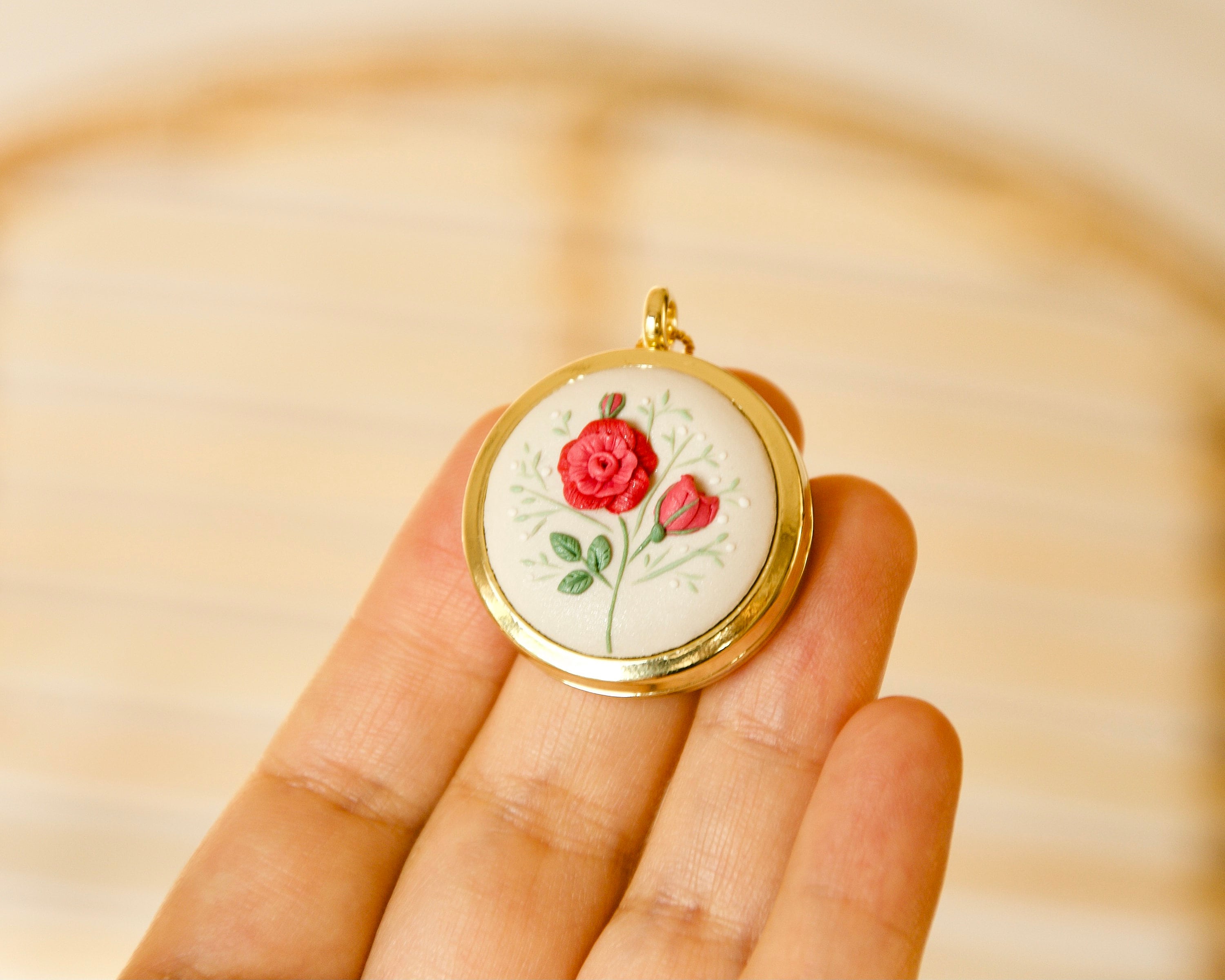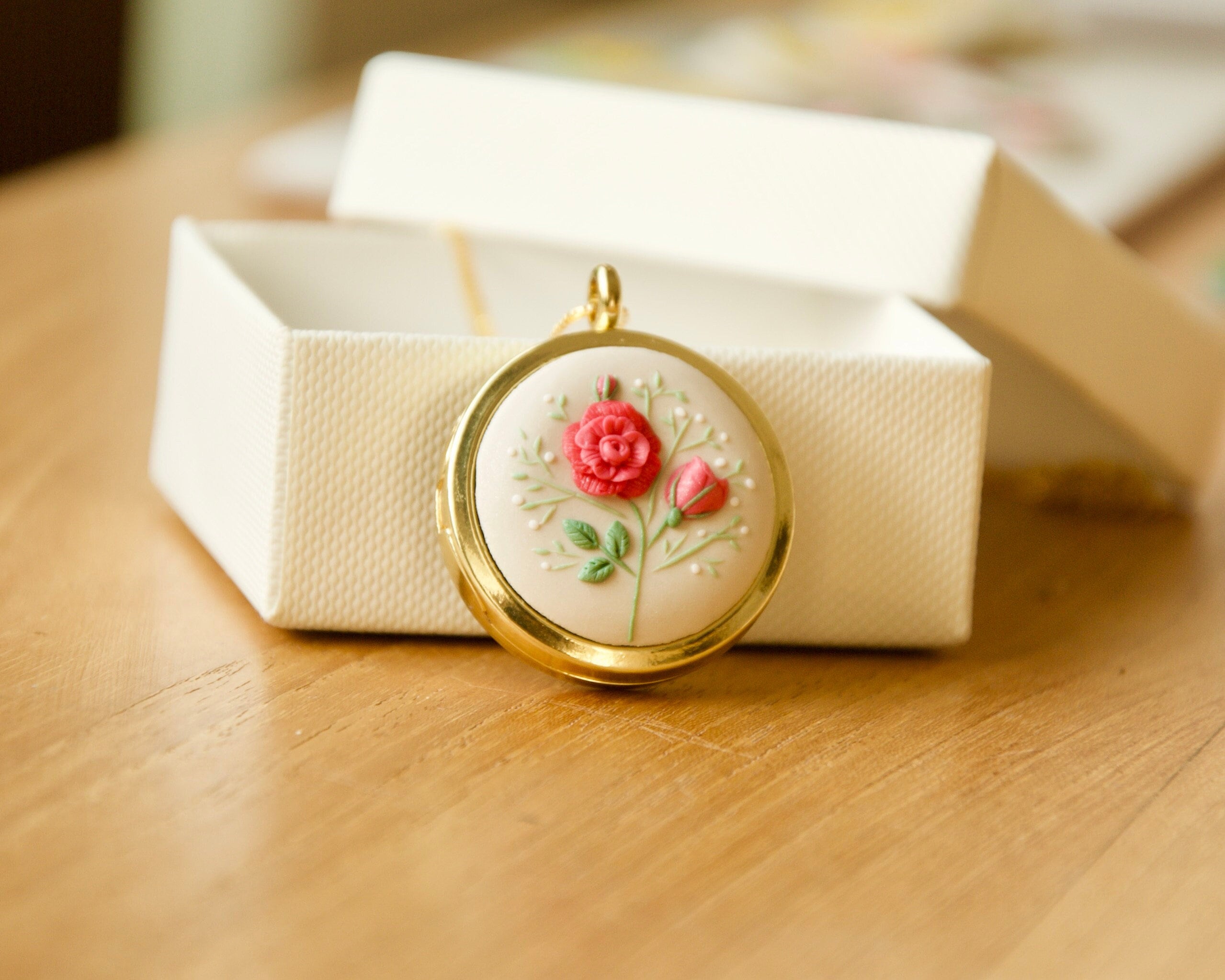 Personalized Rose Locket Necklace – Custom Photo, Polymer Clay Floral Pendant