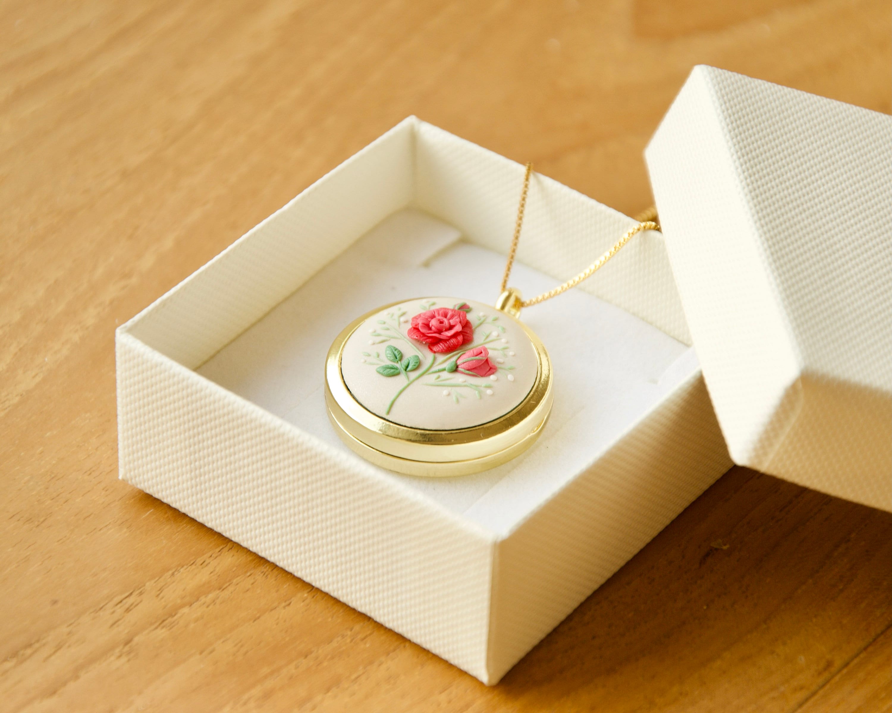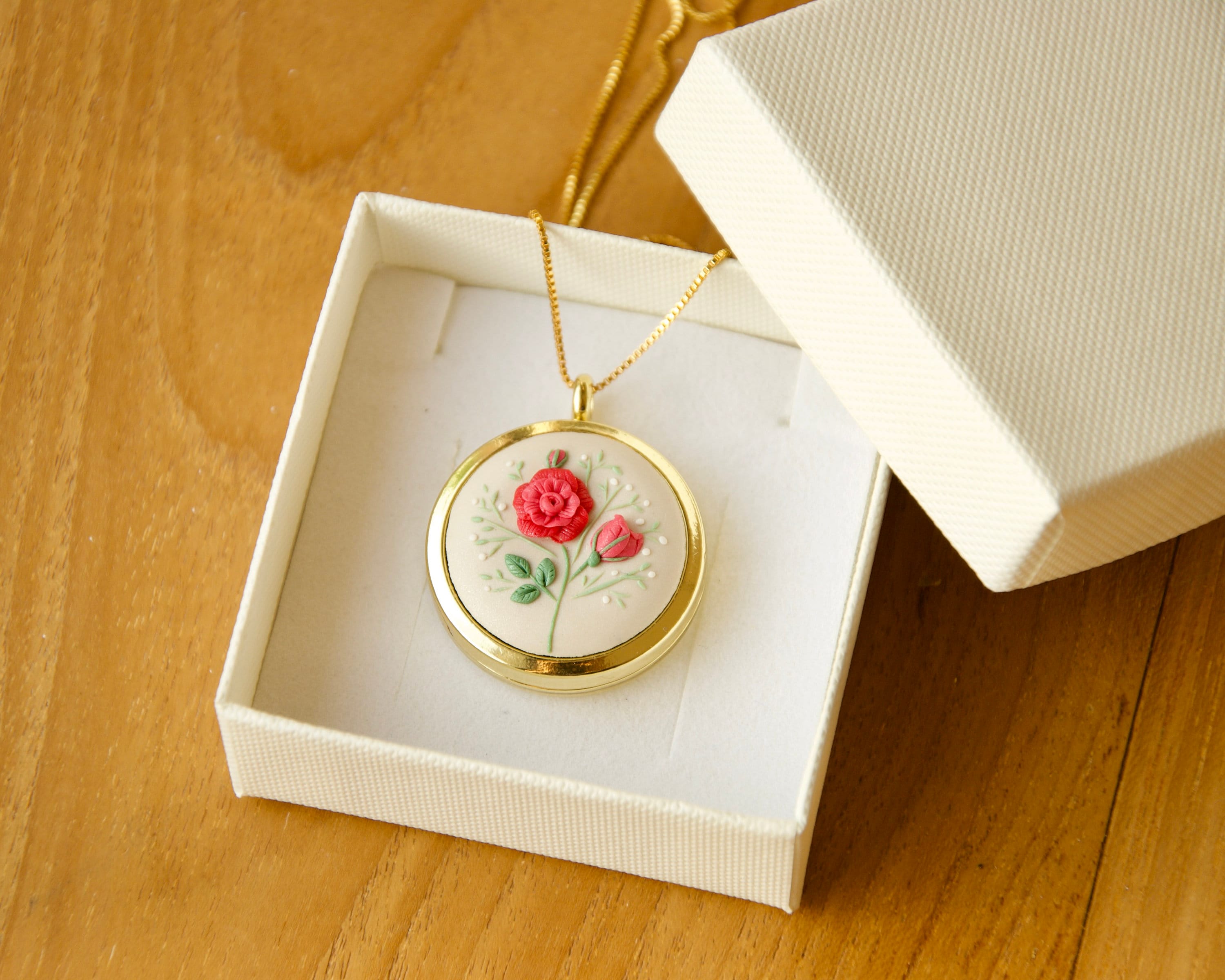 The locket has the same look and feel as embroidery but the material is polymer clay. I created by hand a 3D texture made from tiny pieces of clay added with a needle to the clay base.