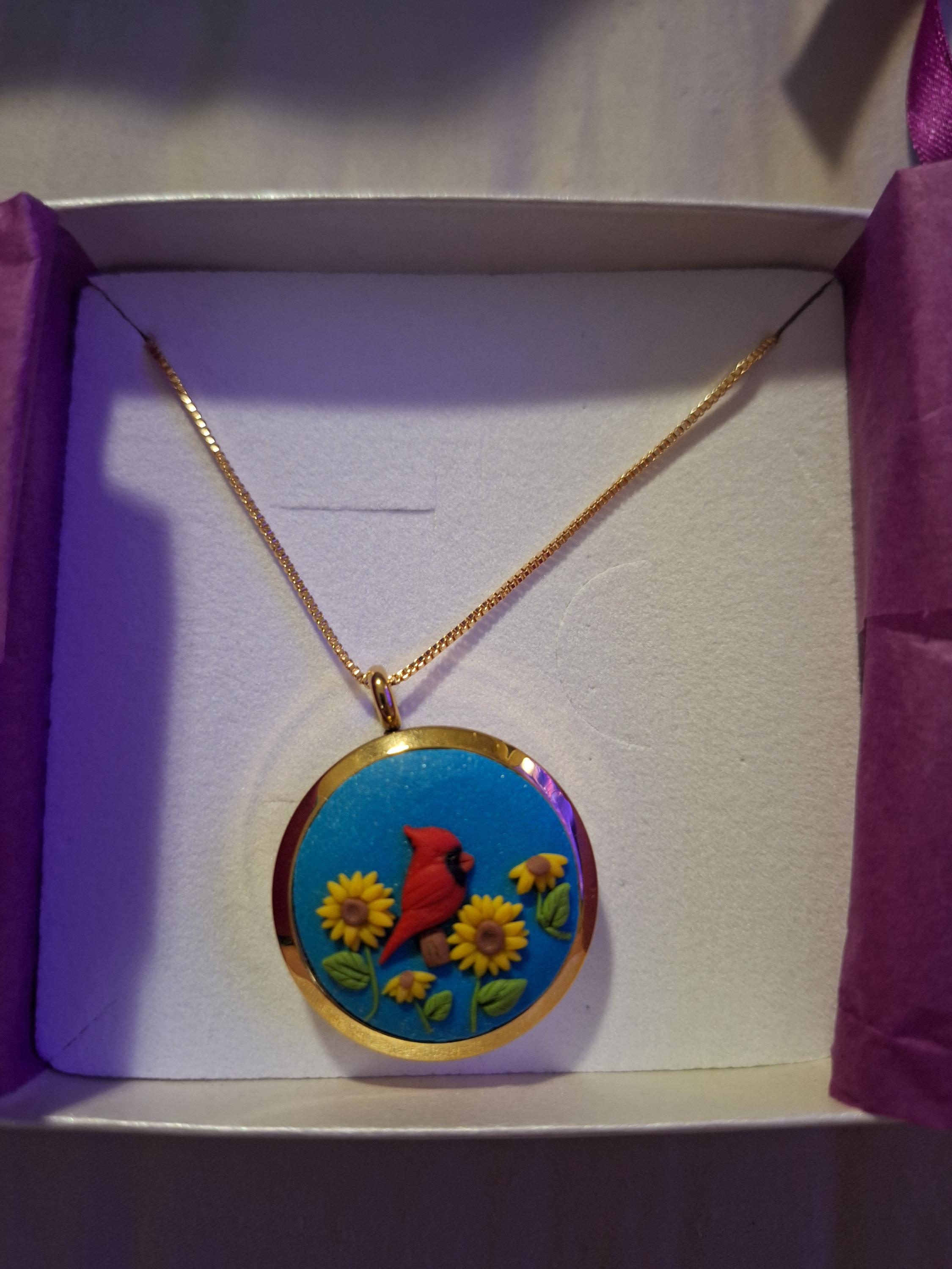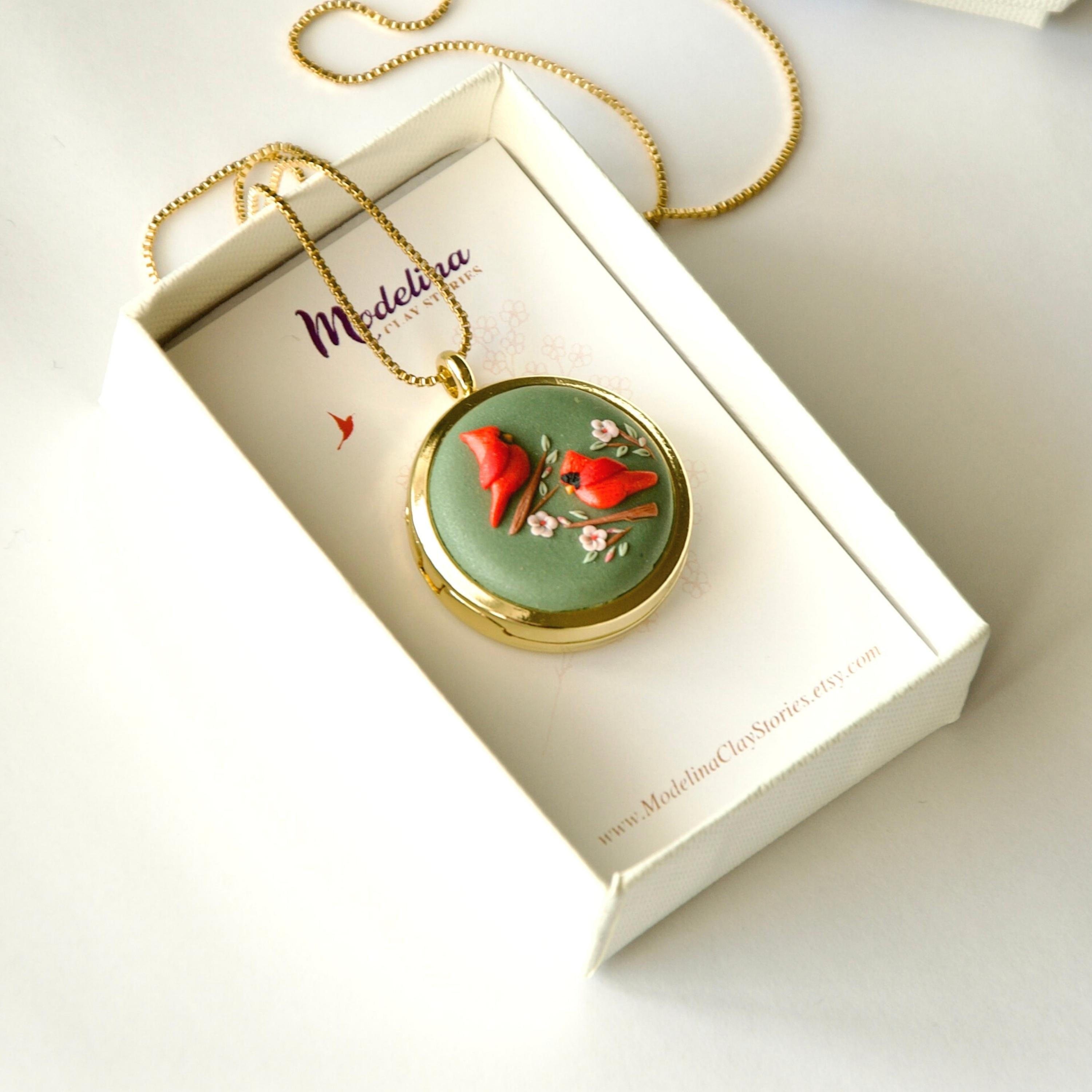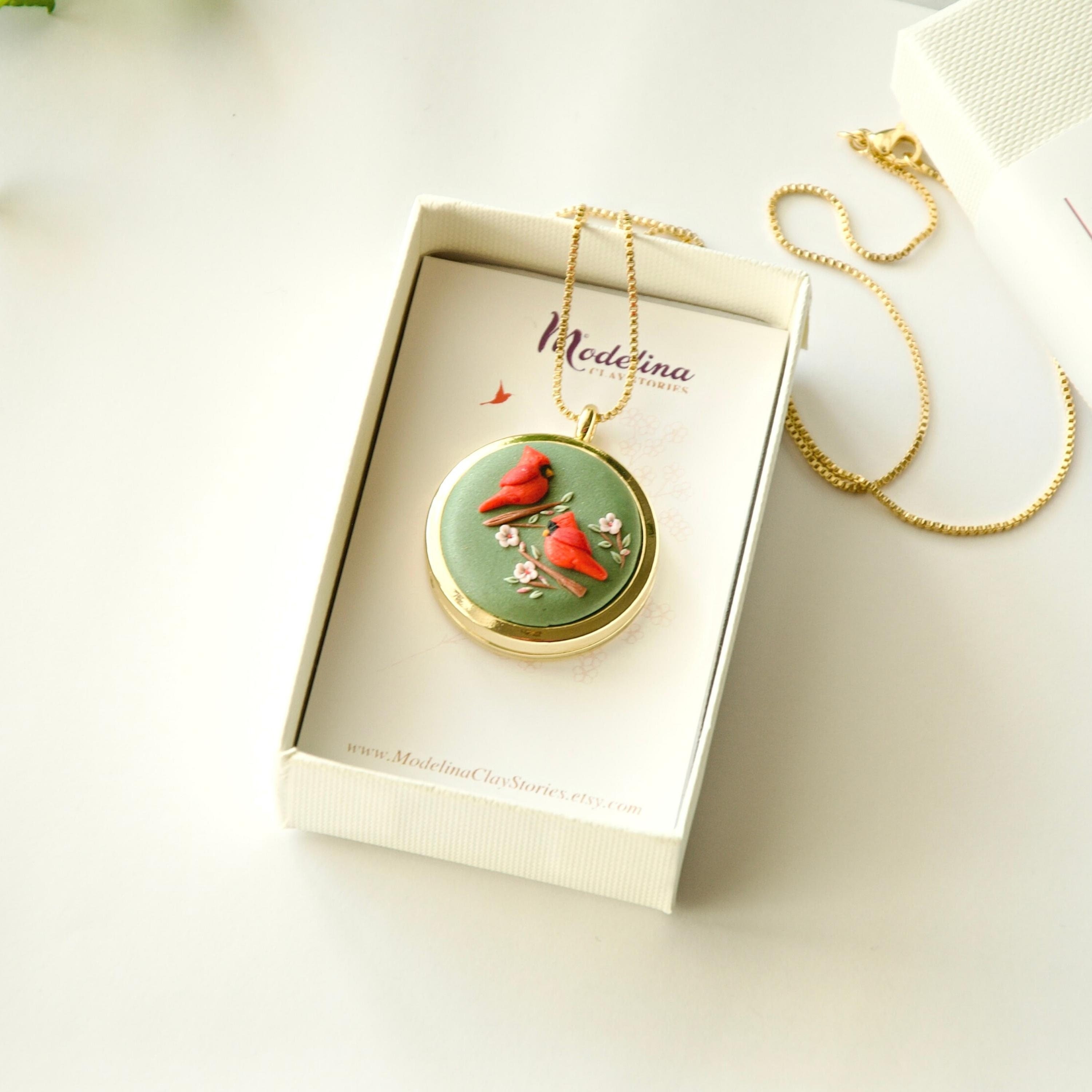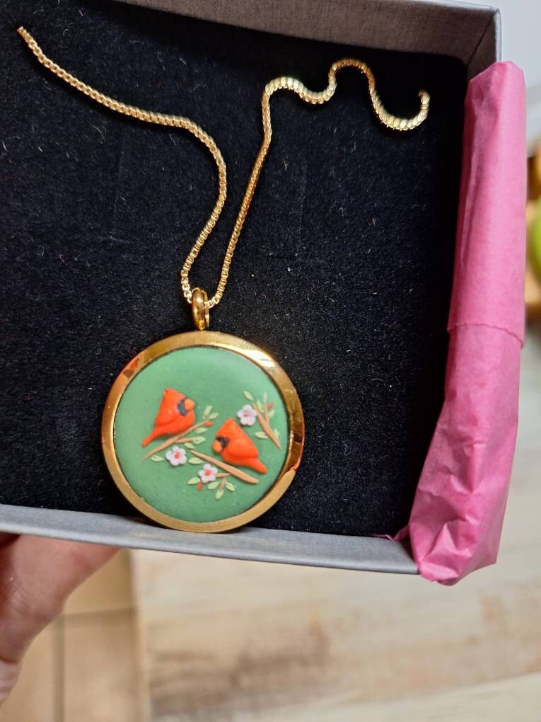 This locket was so gorgeous. It exceeded my expectations and arrived so fast! I will absolutely be purchasing from this seller again and urge anyone who falls in love with a piece from her to do the same. She was amazing! The product was high quality - absolutely gorgeous. The gold was so breathtaking against the cardinals and the green background. And the photos turned out great! 😍🫶🏽