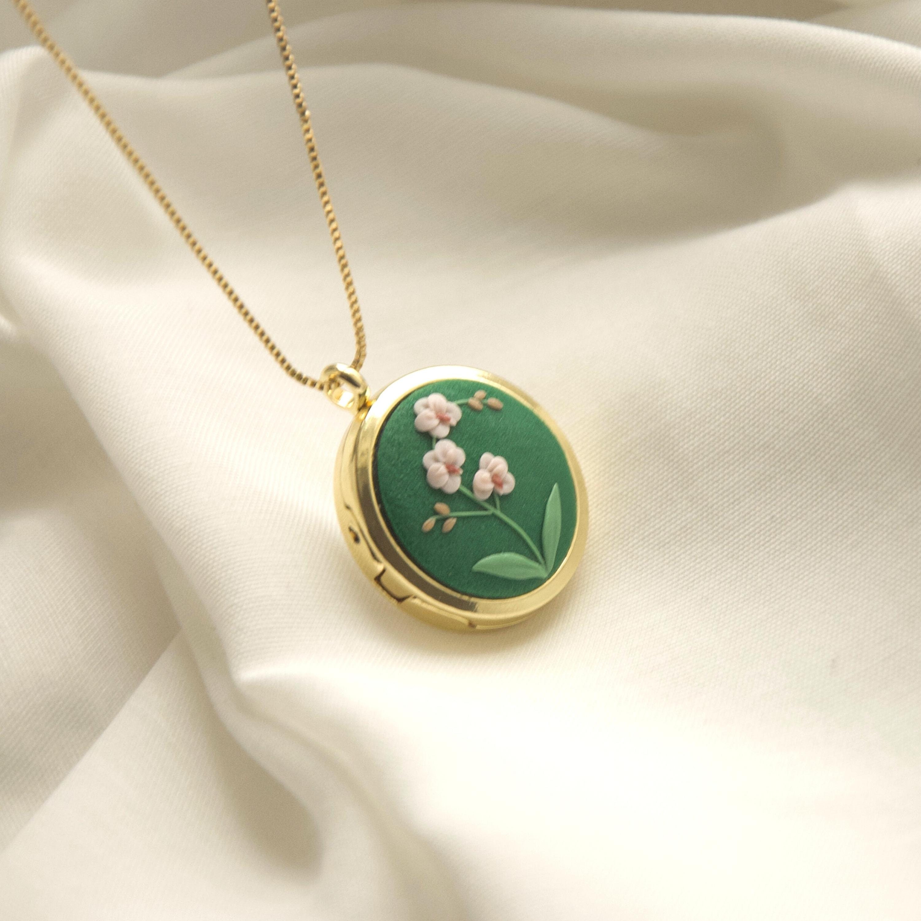 The locket has the same look and feel as embroidery but the material is polymer clay. I created by hand a 3D texture made from tiny pieces of clay added with a needle to the clay base.