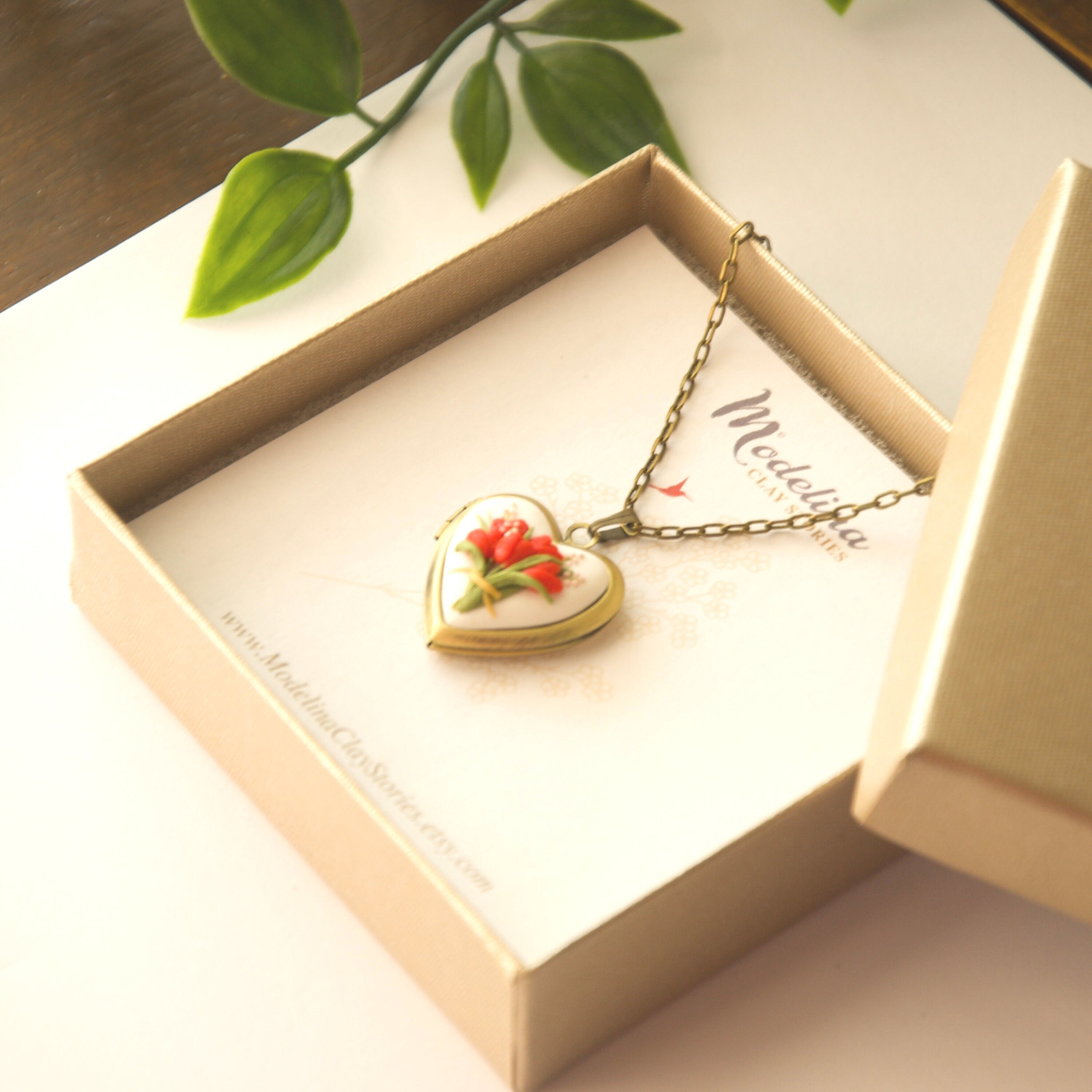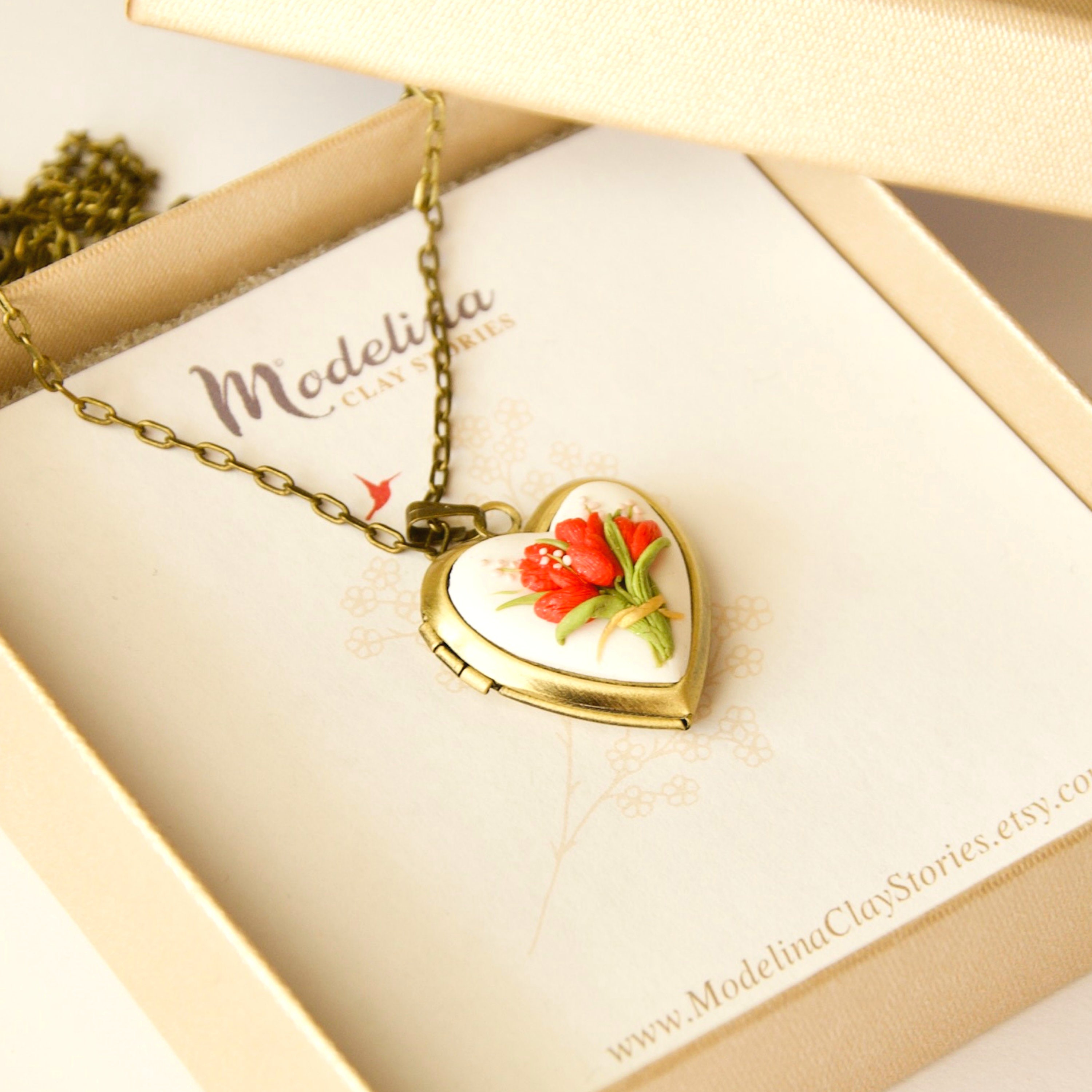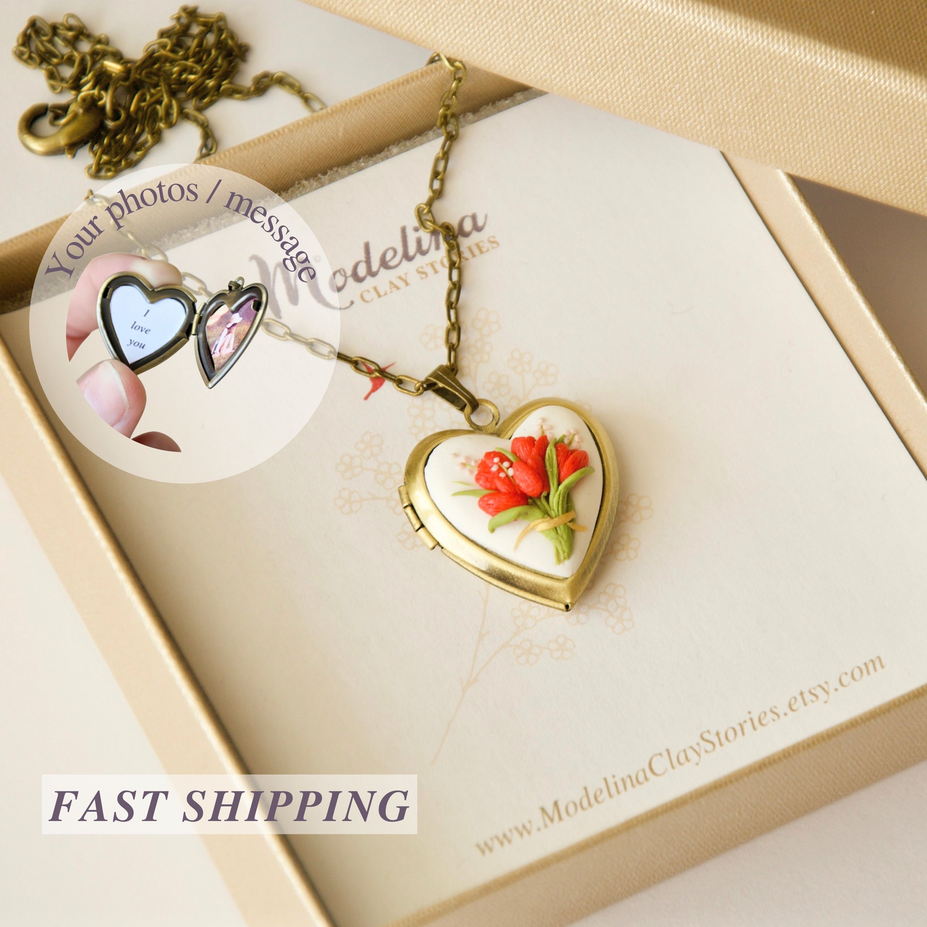 Floral locket necklace, Vintage photo locket, Tulips bouquet, Personalized with photos gift for mom, Unique birthday gift Wife For her
