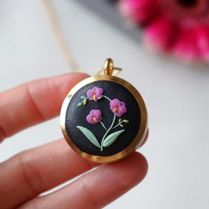 The locket has the same look and feel as embroidery but the material is polymer clay. I created by hand a 3D texture made from tiny pieces of clay added with a needle to the clay base.