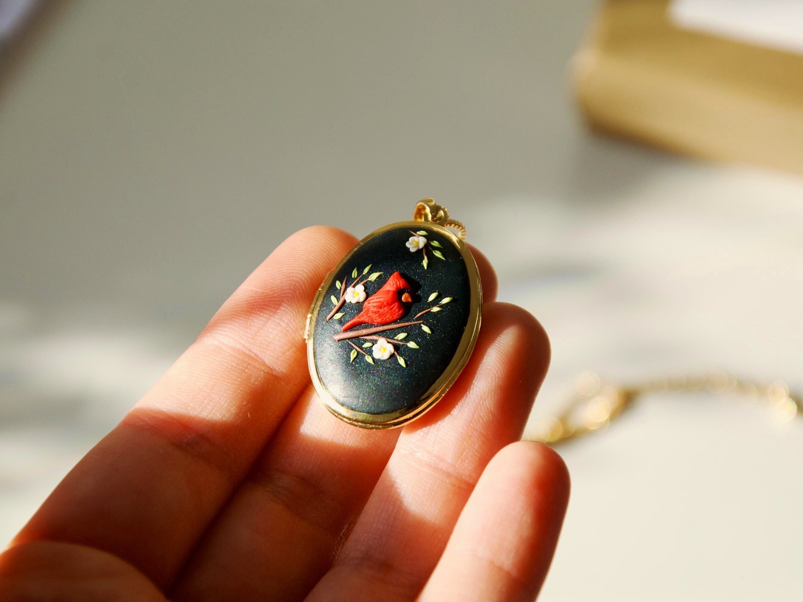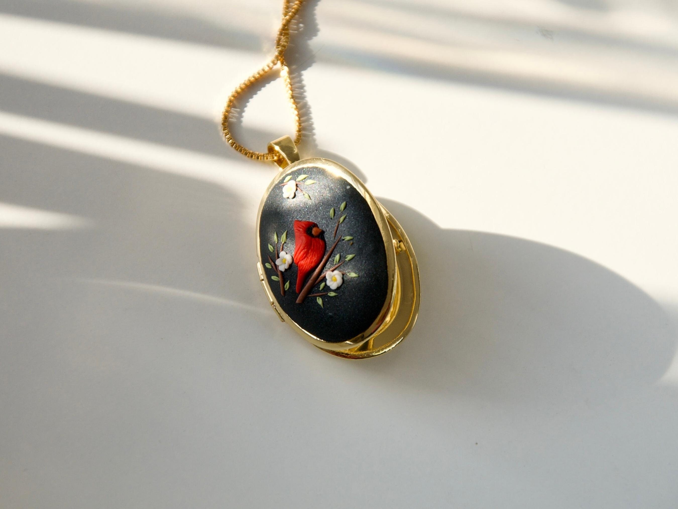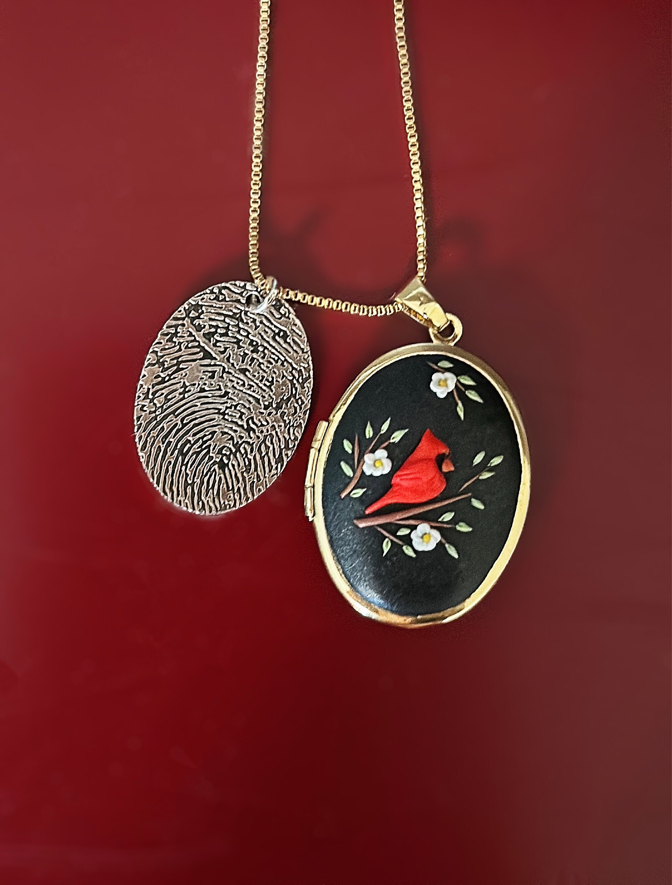 my dad passed away 2 years ago and i’ve felt so low ever since. my dad was my everything. when we got home from his funeral, a cardinal flew beside our car and landed on our fence. then it flew onto his rocking chair. ever since then for every holiday/birthday/ or just in times where I need that reminder he’s still here. I have his thumbprint on a pendant and as soon as I saw this, I had to have it. I added it to my thumbprint pendant so I can keep our pictures at my heart where the necklace falls to. picture do not do this justice. it’s so beautiful in person. the locket itself has a strong clasp so it doesn’t open with the littlest touch. the pictures on the inside look perfect. the package actually arrived the day before his 2 year anniversary. I can’t thank this seller enough. customer service was amazing too.