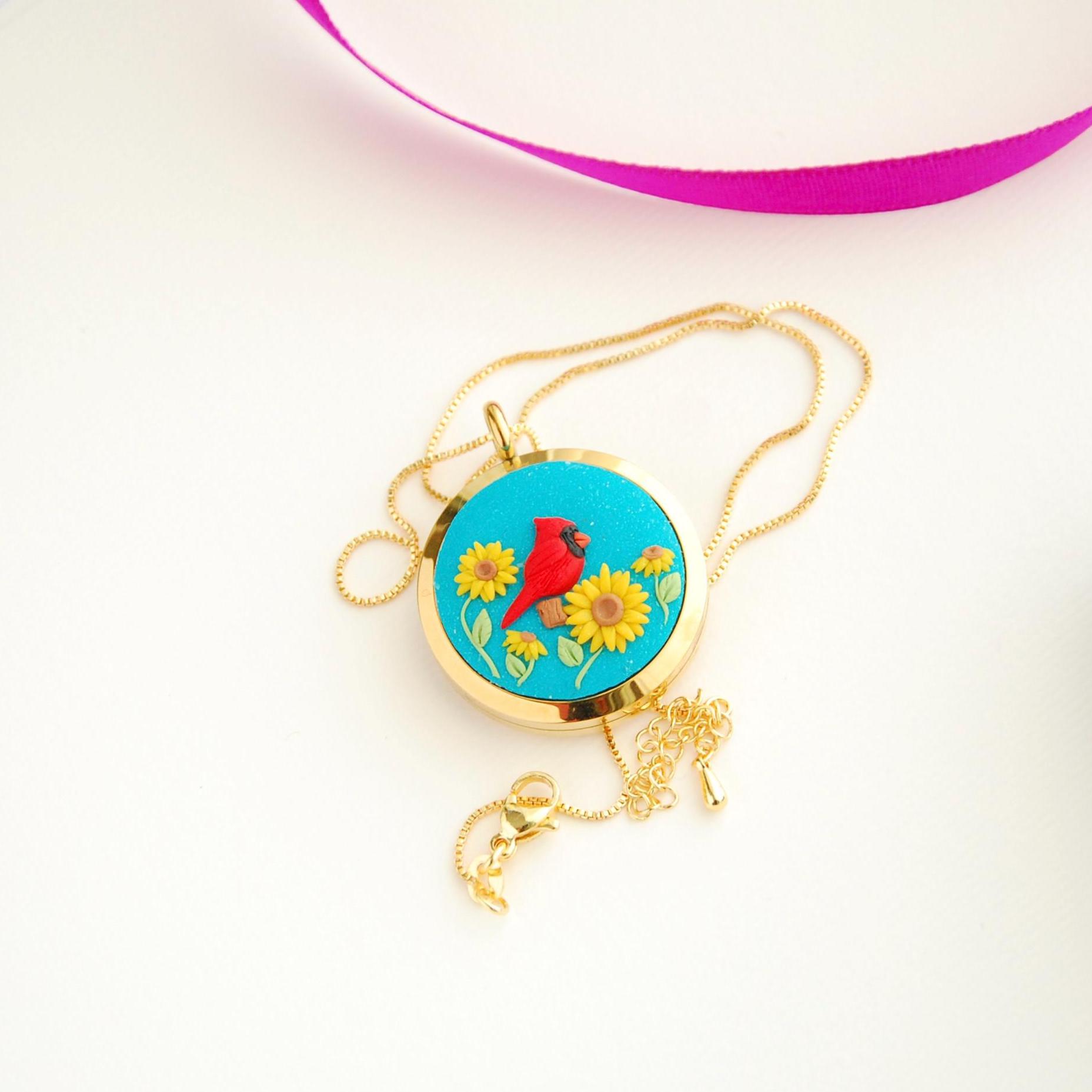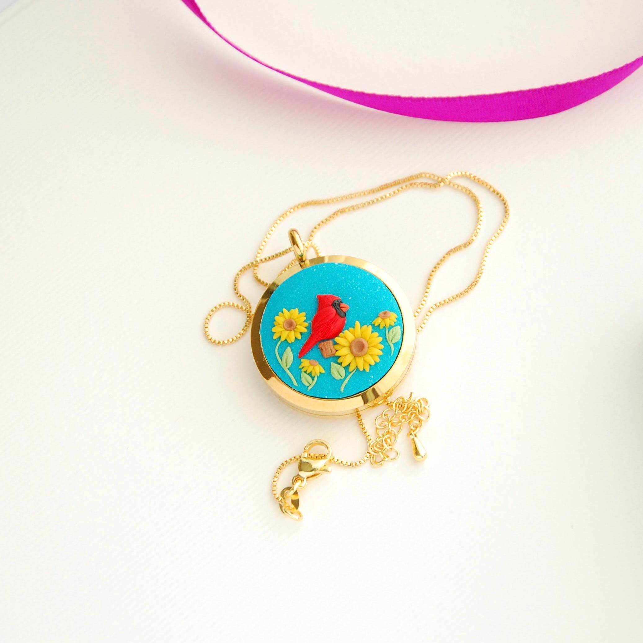 This round gold-plated locket features a vibrant red cardinal resting among hand-sculpted sunflowers, set against a bright turquoise background with subtle shimmering details.