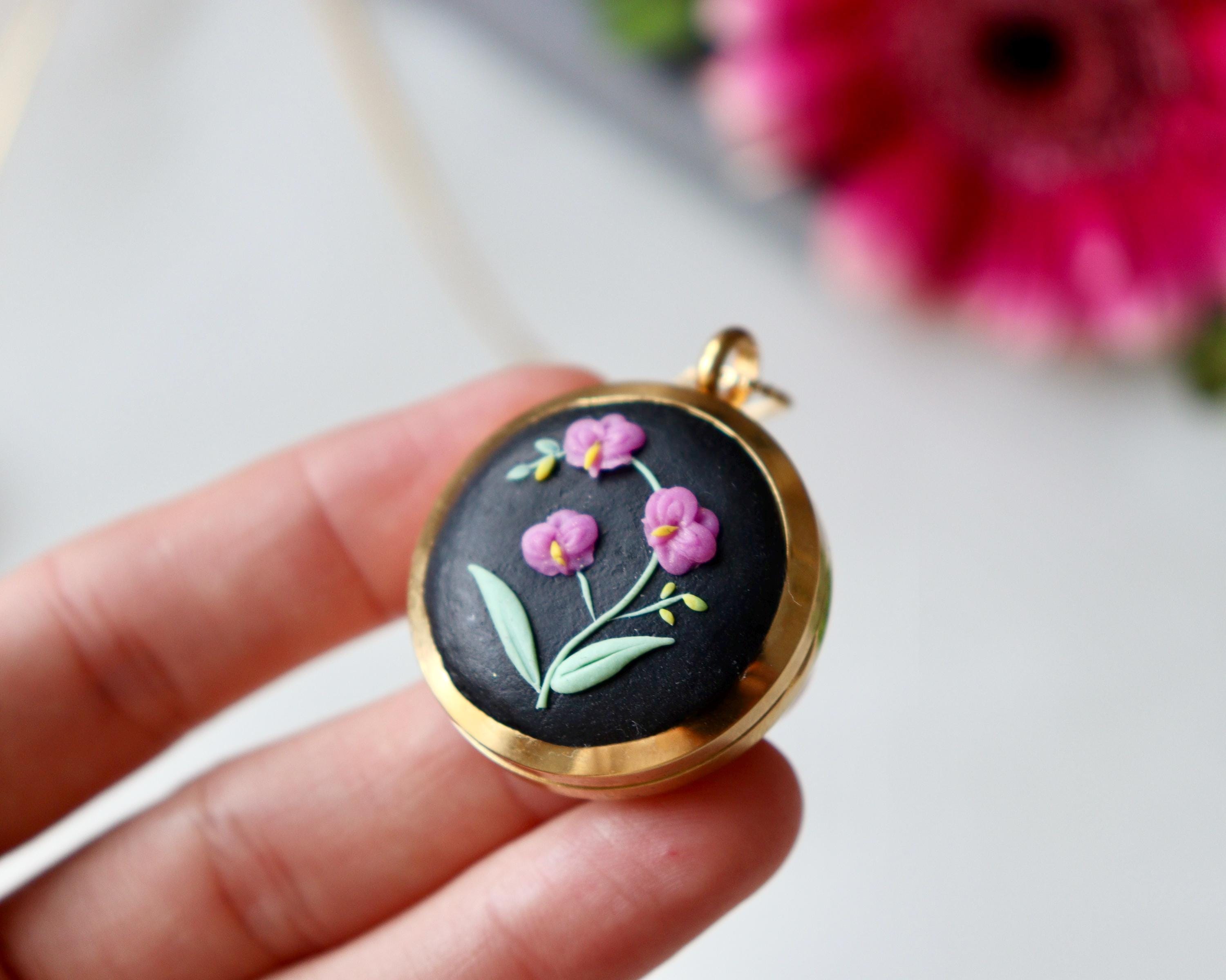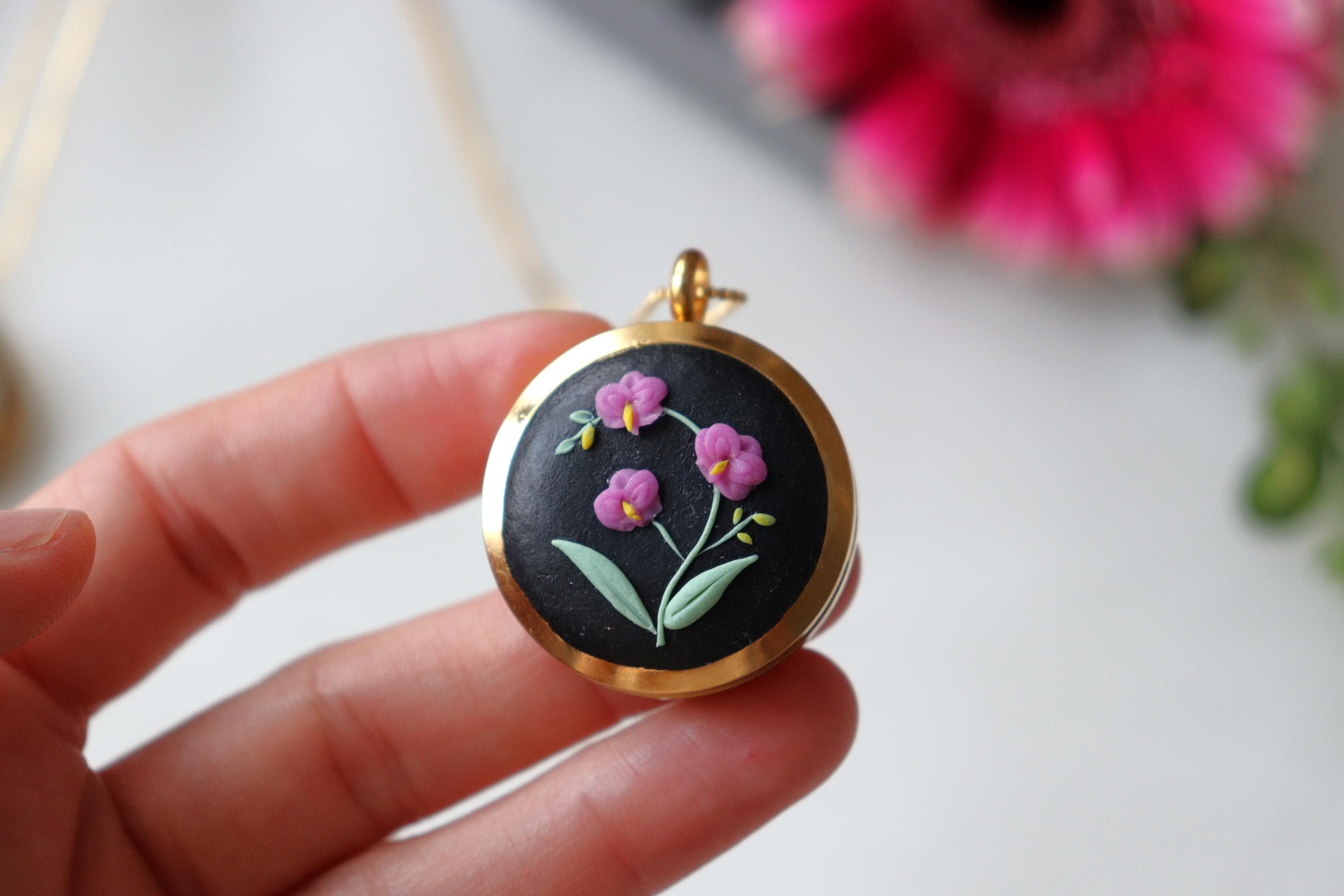 A locket full of charm – this round pendant features a delicately handcrafted orchid, petal by petal, made from polymer clay. Inspired by the timeless beauty of orchids, it’s a meaningful gift or a special piece to keep close to your heart.