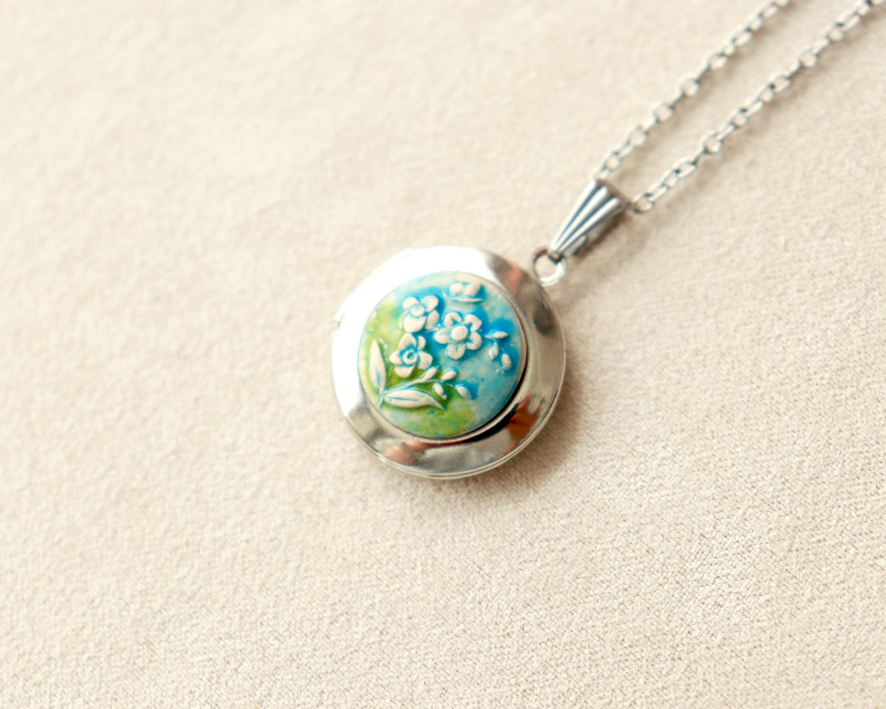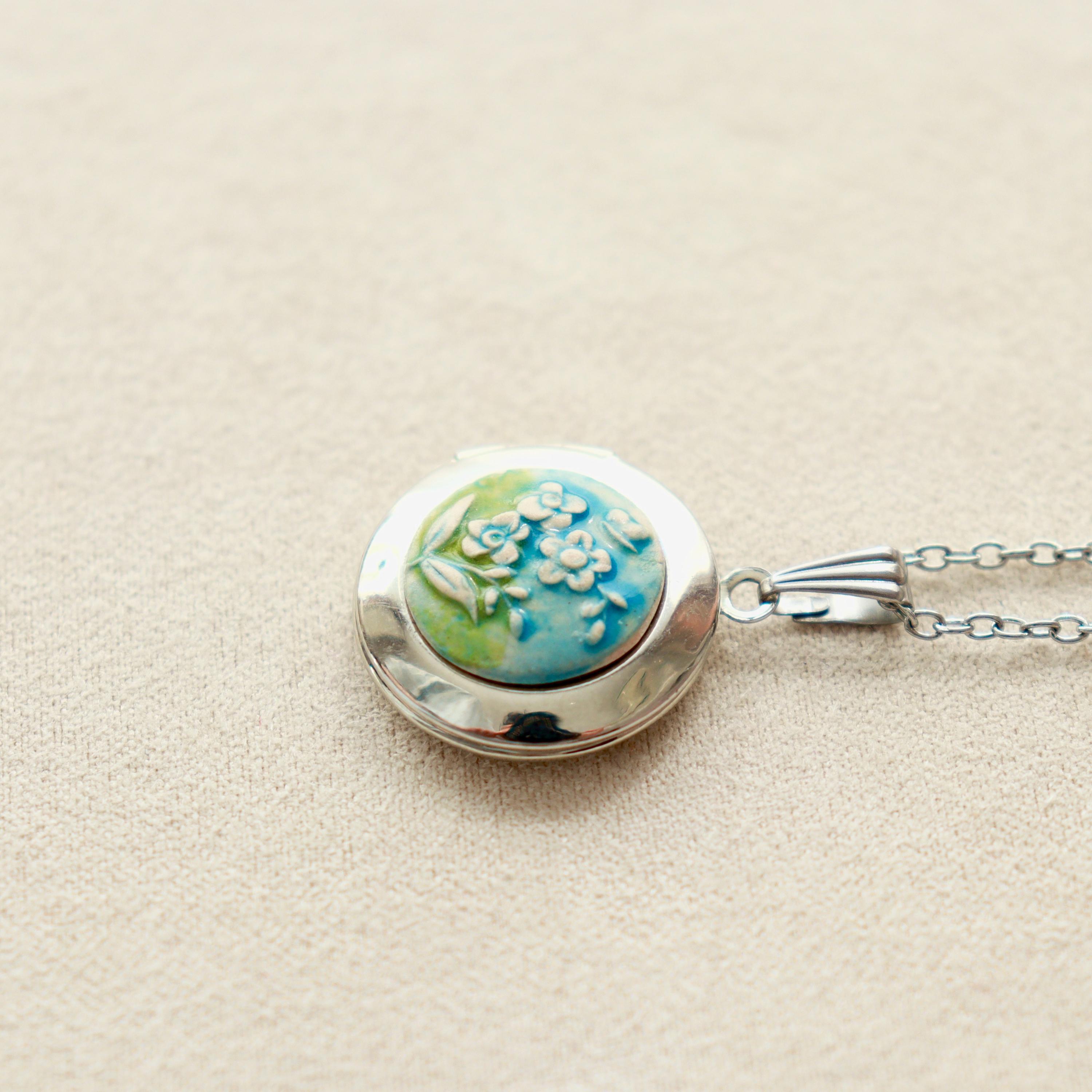Ceramic Floral Locket Necklace, Pastel Keepsake Pendant, Forget-me-not flower
