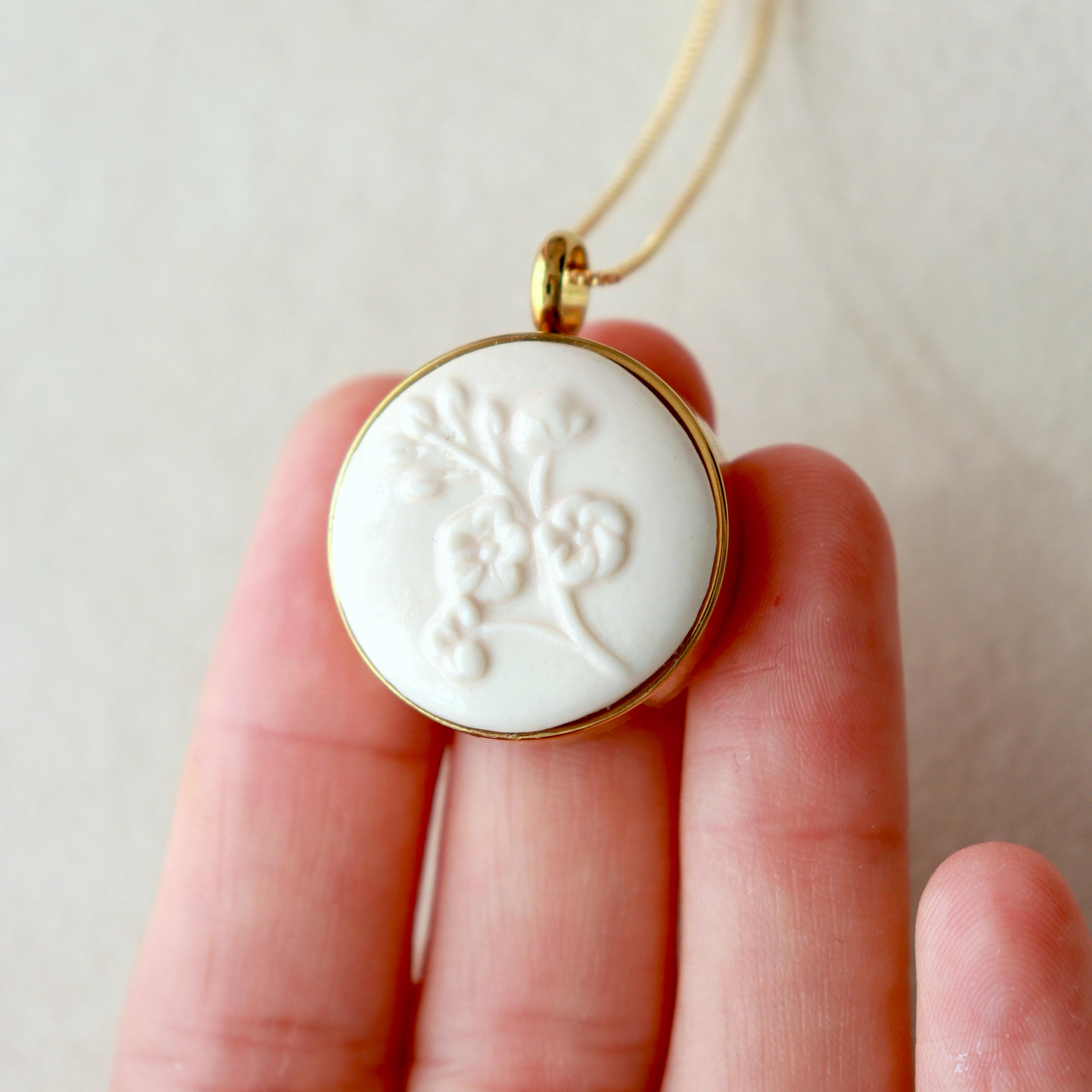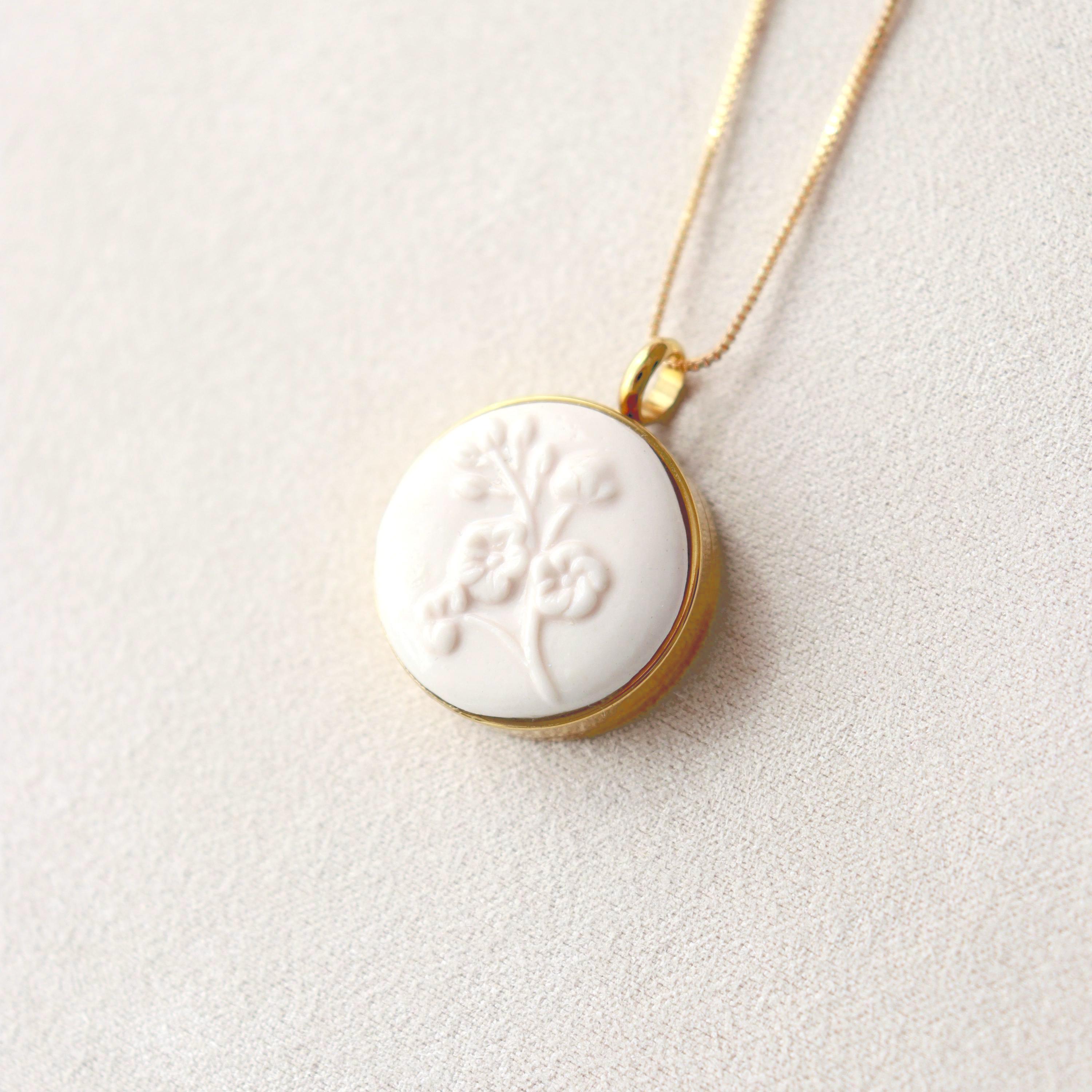 This handmade necklace features a ceramic floral centerpiece, softly sculpted in pastel tones and set into a round locket. Each piece is carefully crafted, making every pendant subtly unique.