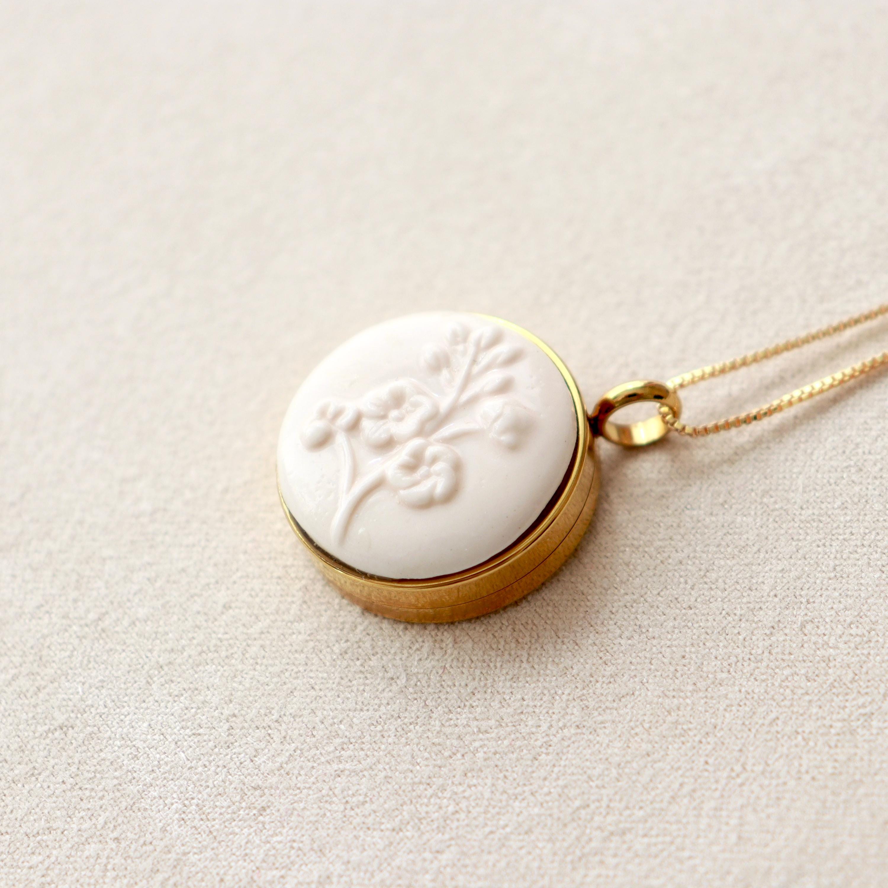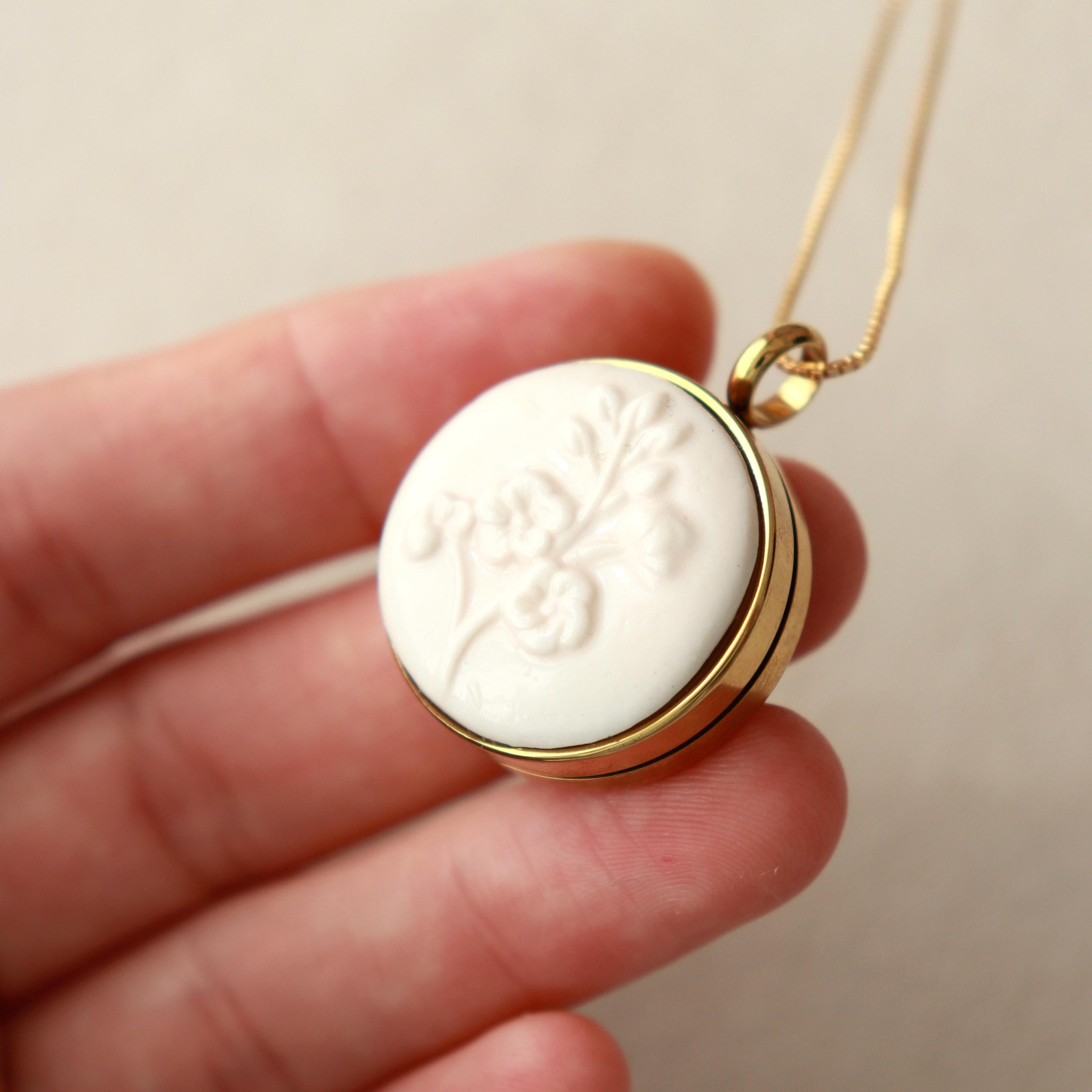 Porcelain Floral Locket Necklace, Pastel Keepsake Pendant, Forget-me-not flower