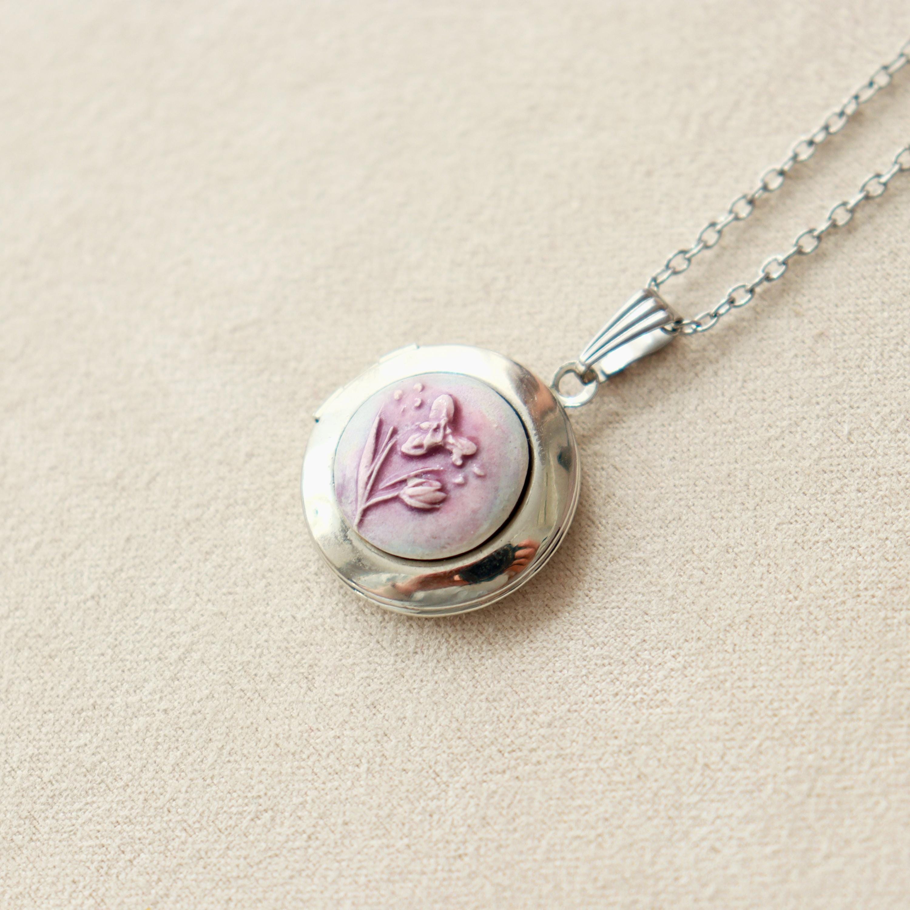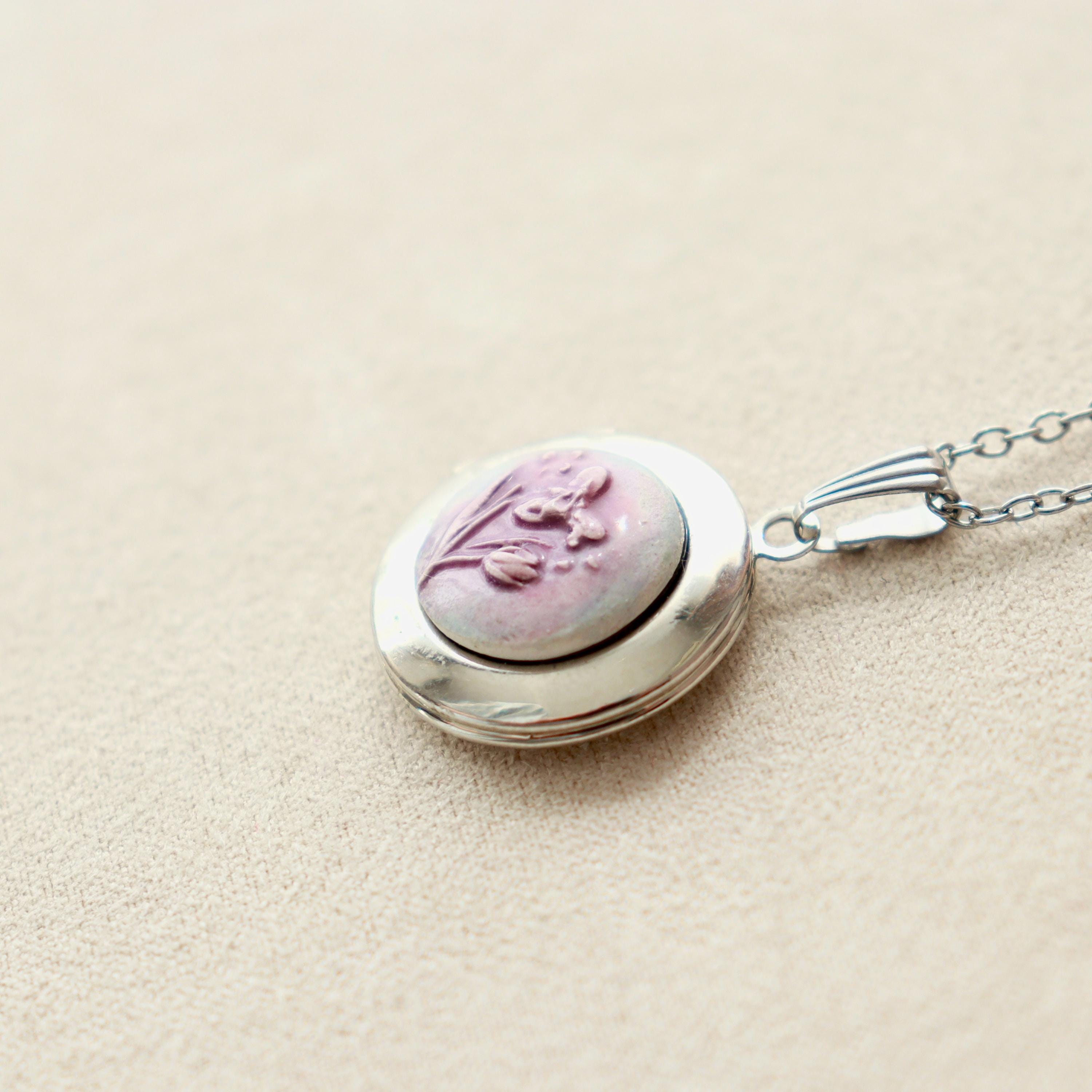 Floral Ceramic Locket Necklace, Personalized Photo Locket, Silver Tone Keepsake Pendant