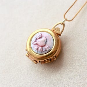 This handmade necklace features a ceramic floral centerpiece, softly sculpted in pastel tones and set into a round locket. Each piece is carefully crafted, making every pendant subtly unique.