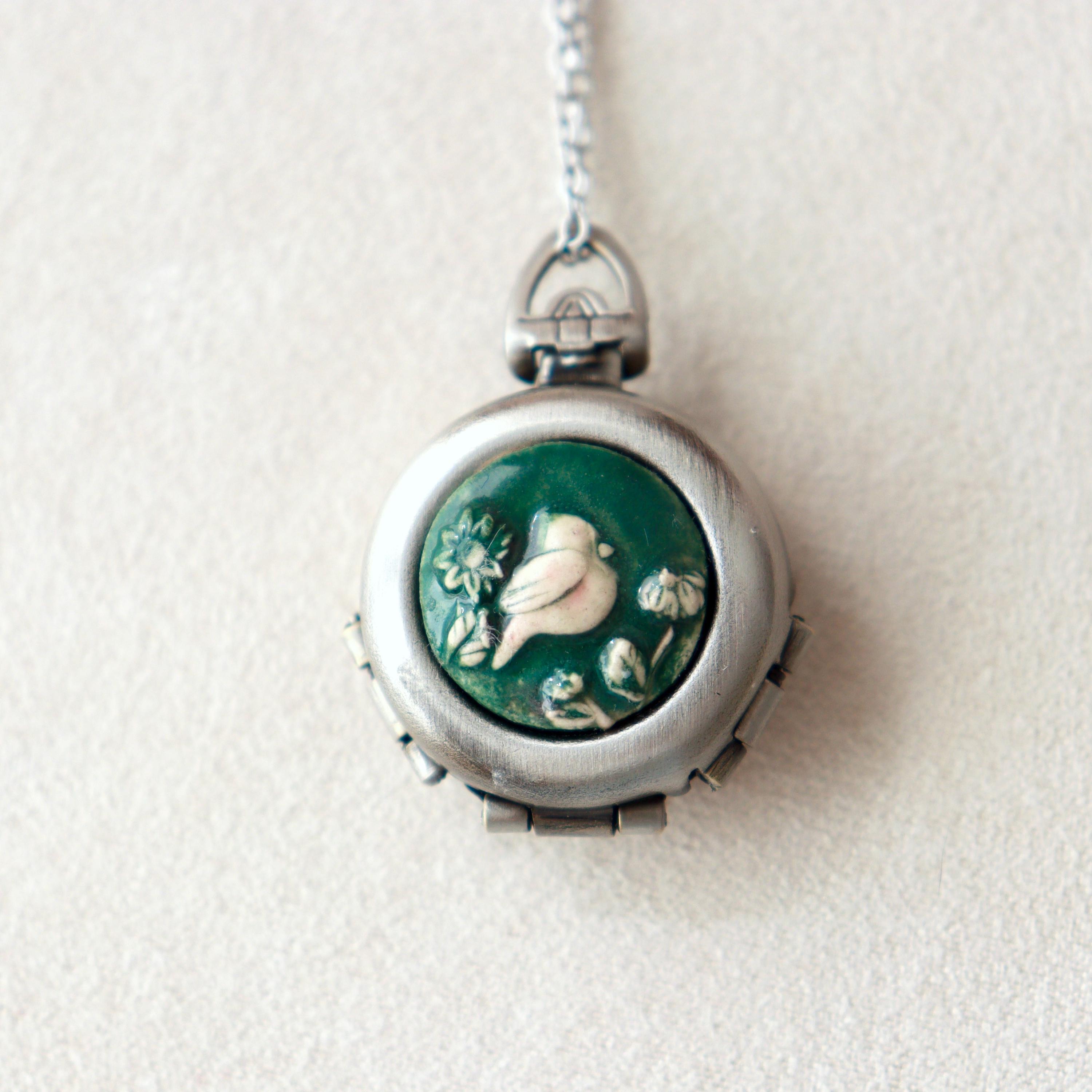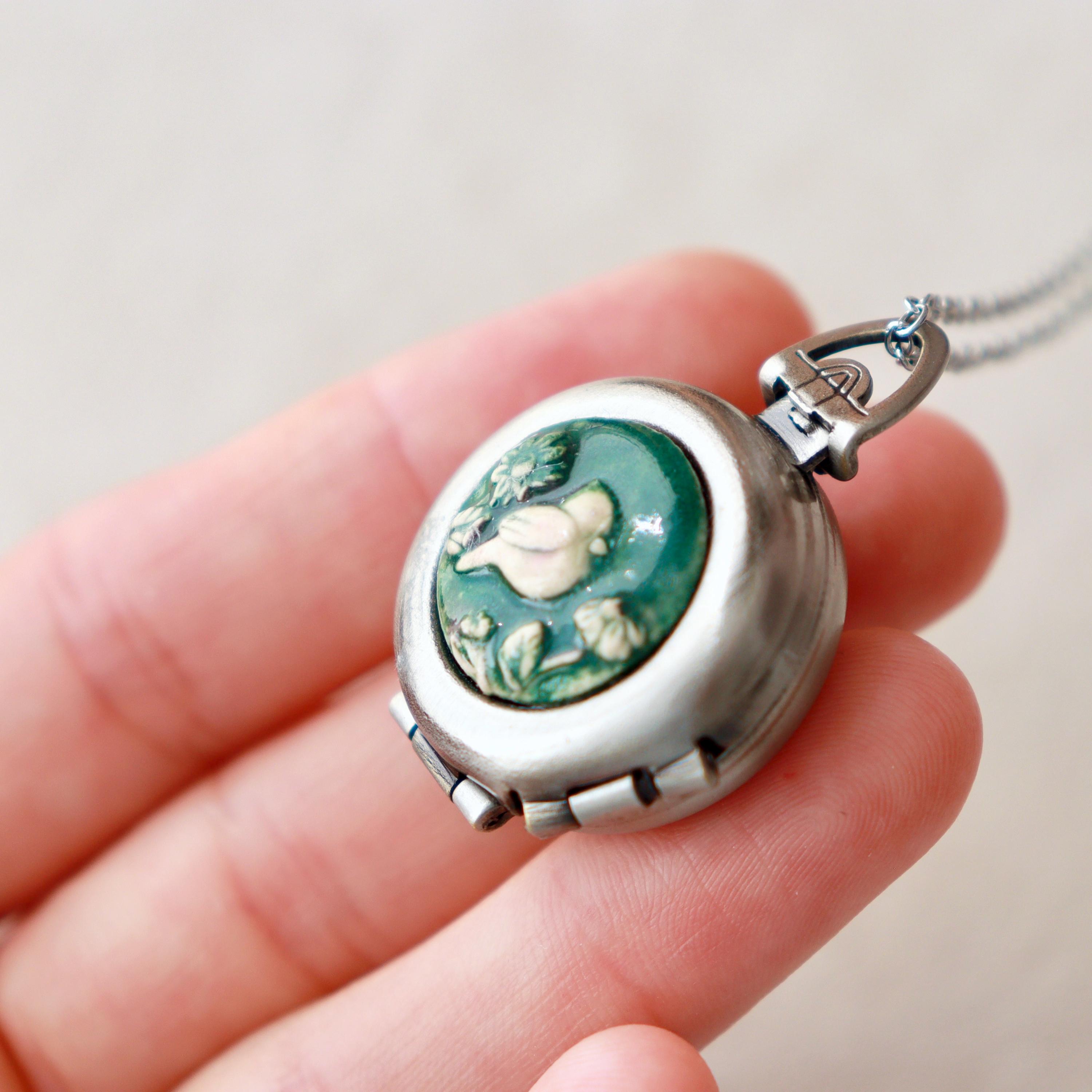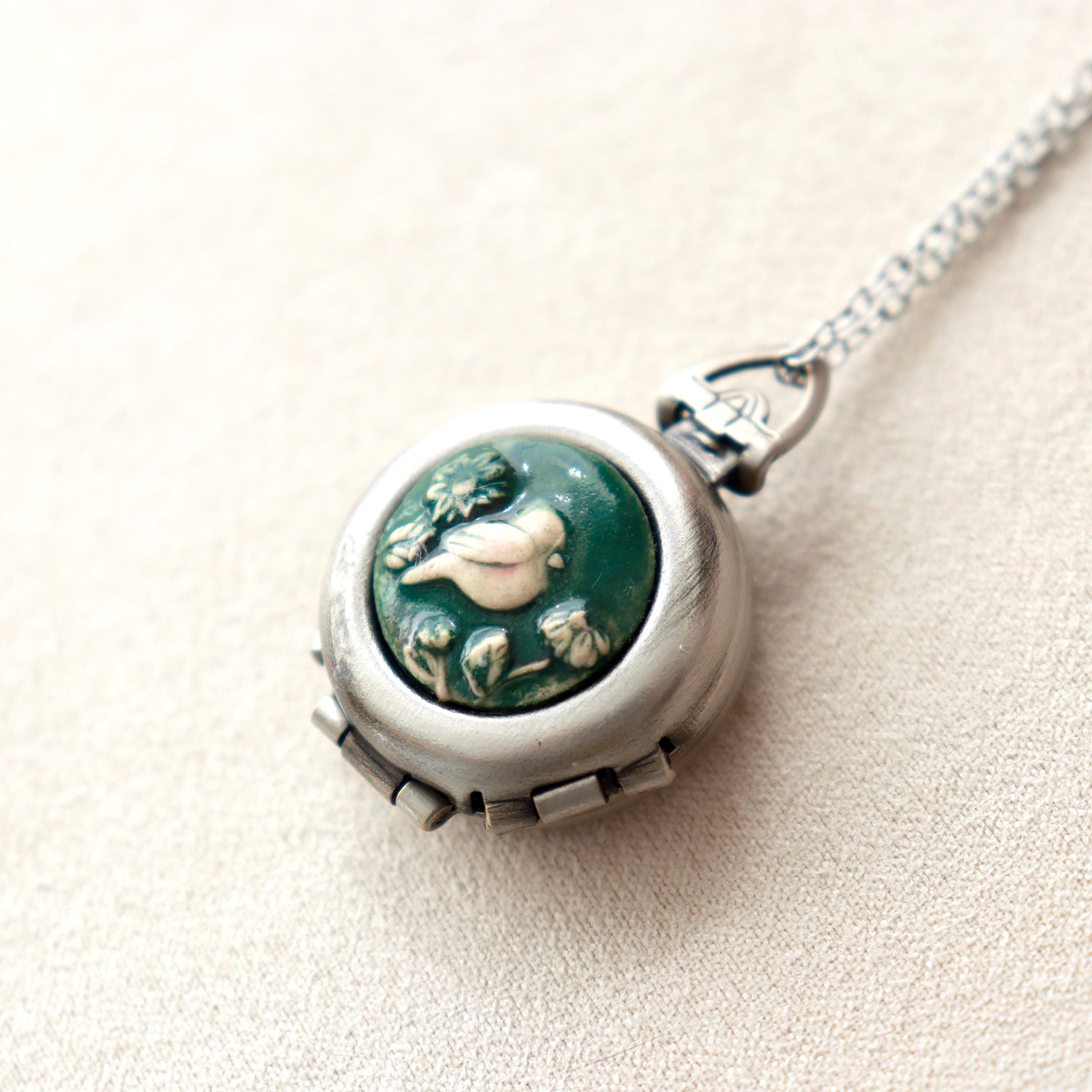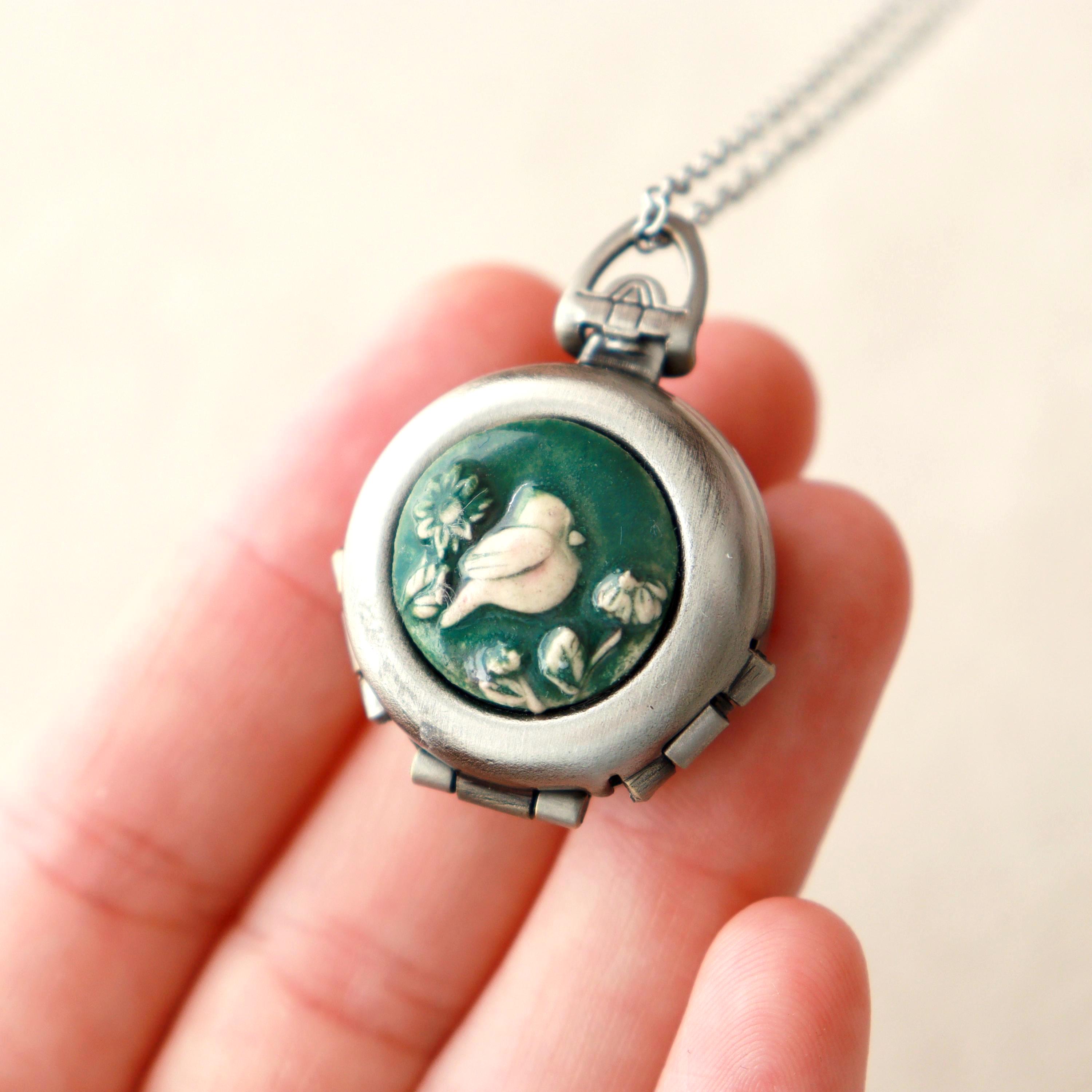 Floral Ceramic Locket Necklace, Personalized Photo Locket, Silver Tone Keepsake Pendant