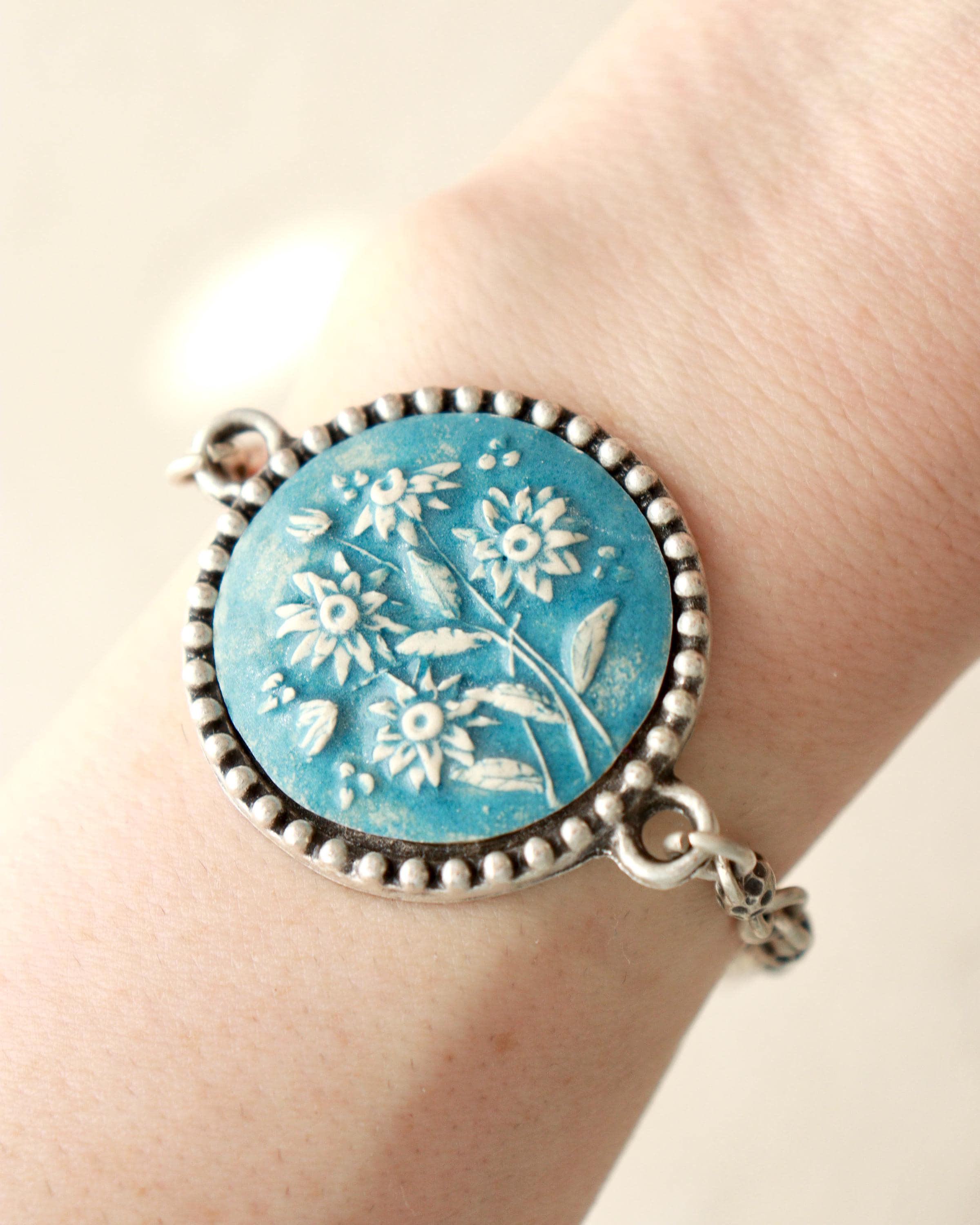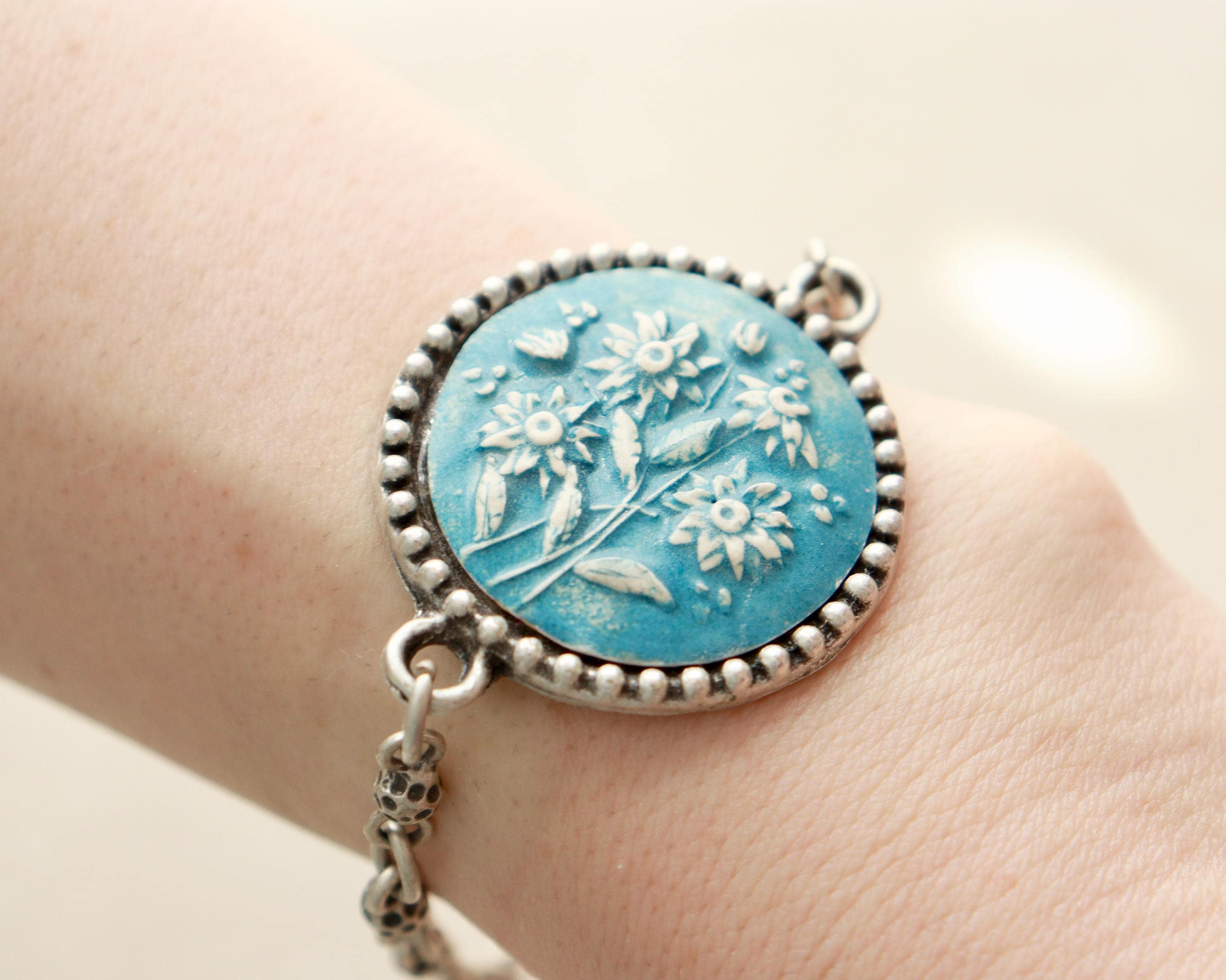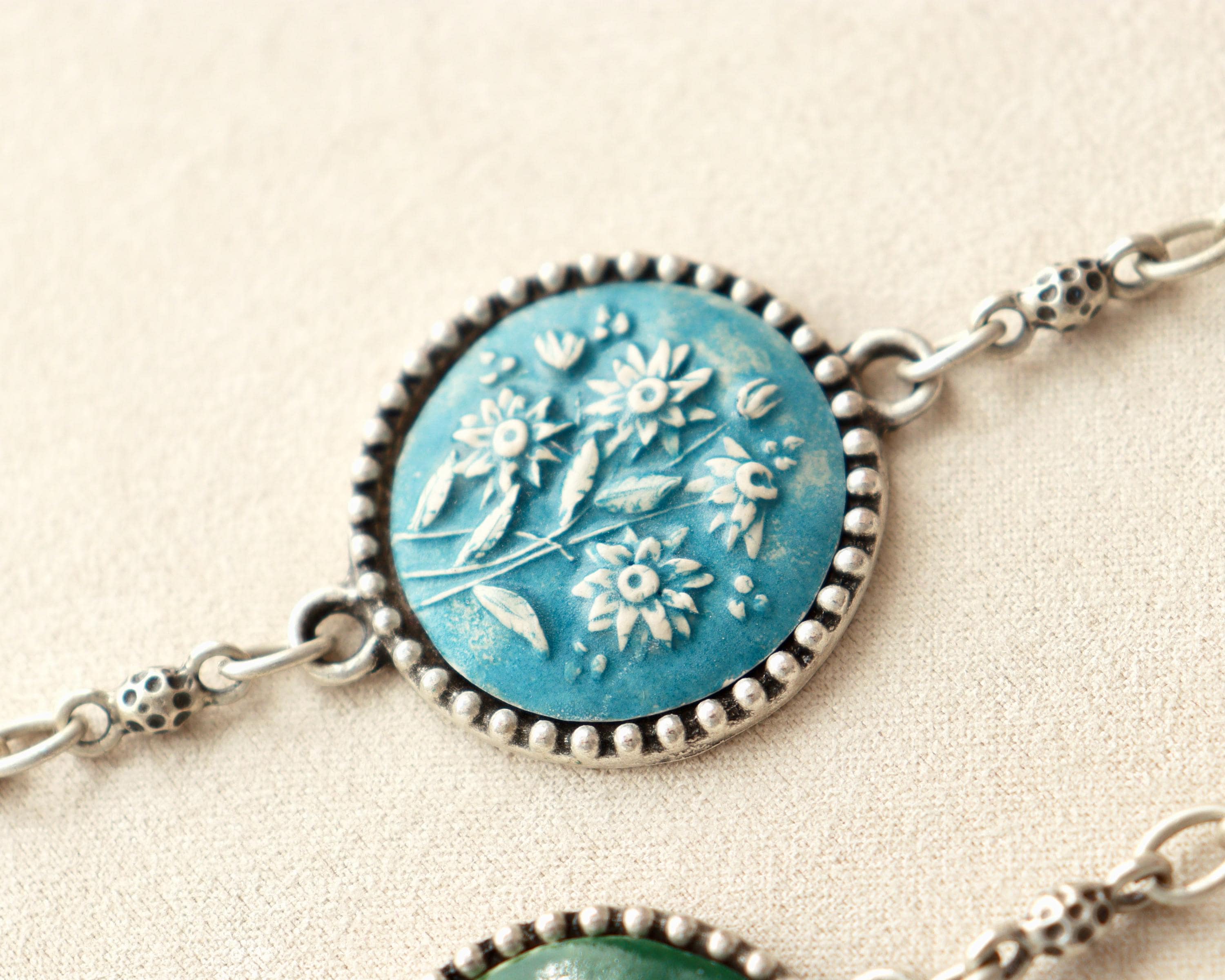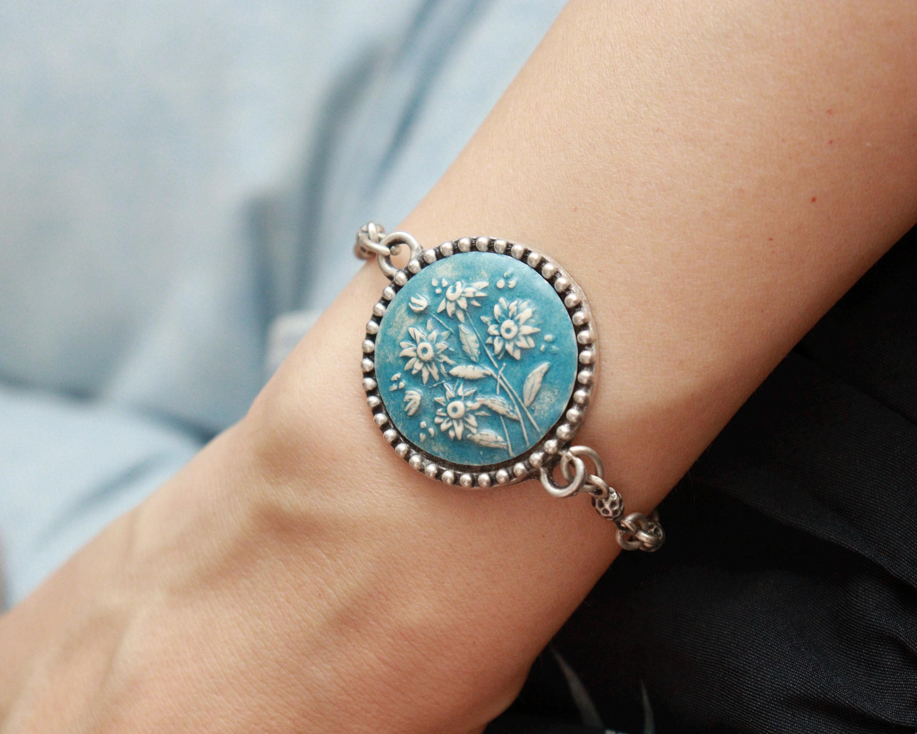 Blue Botanical Bracelet – Handmade Nature-Inspired Jewelry, Floral Cabochon Bracelet, Vintage Style Statement Bracelet