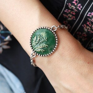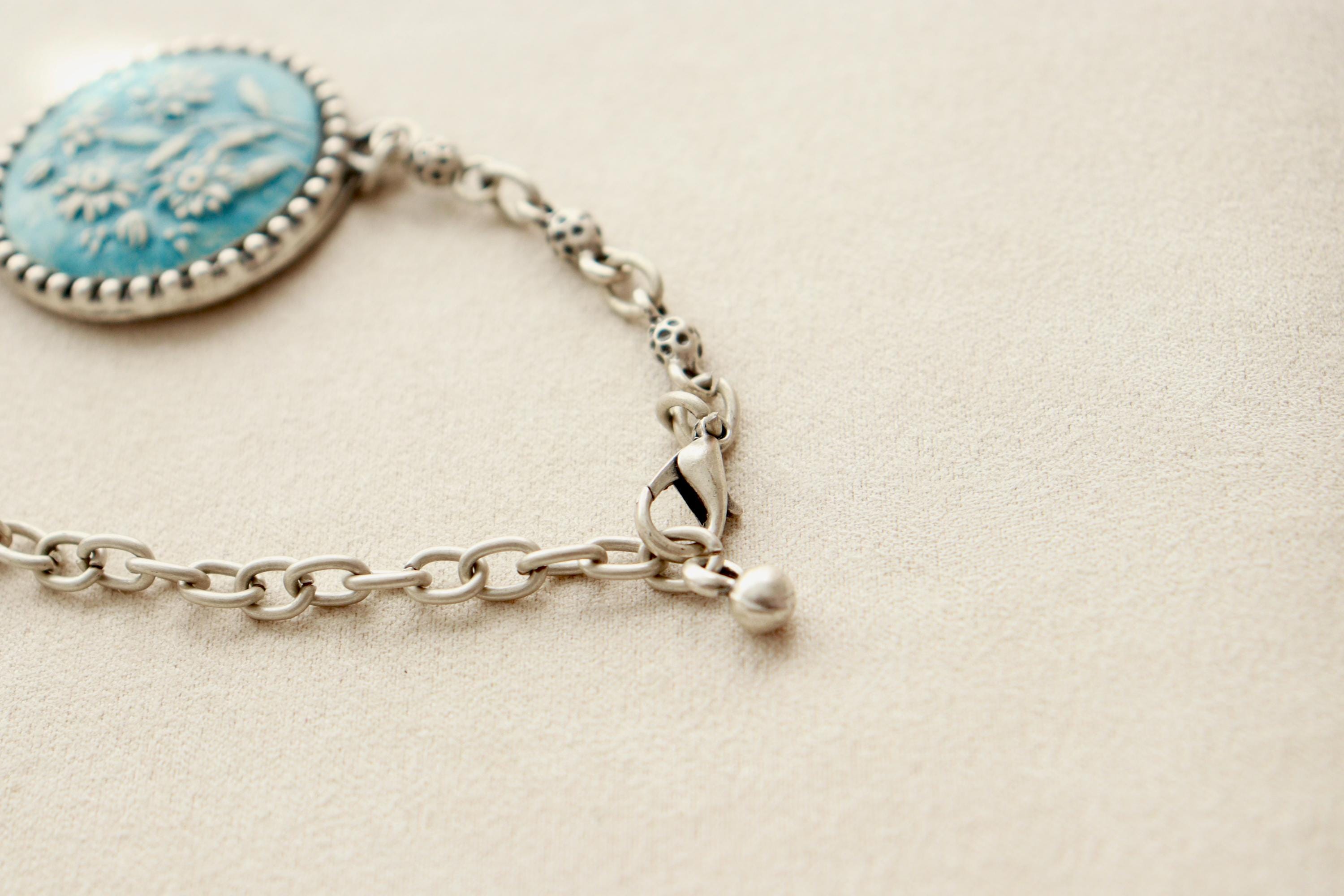 This handmade bracelet features a round blue cabochon with a delicate botanical design. Elegant and versatile, it complements both everyday outfits and special occasions.