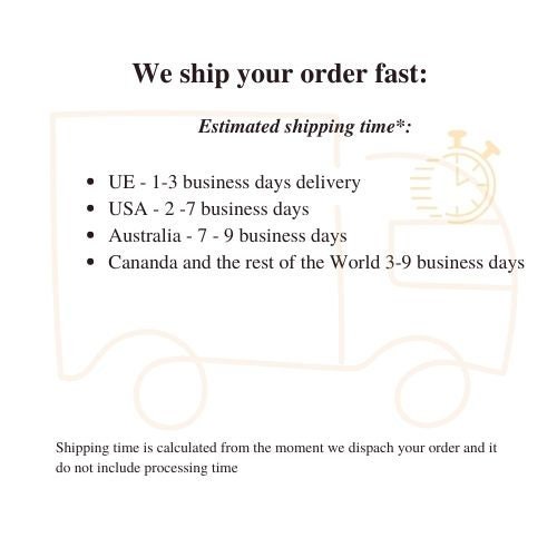 The shipping time is short, depending on the country 2-3 days (USA, Canada, EU) or 1 week for Australia and rest of the world.